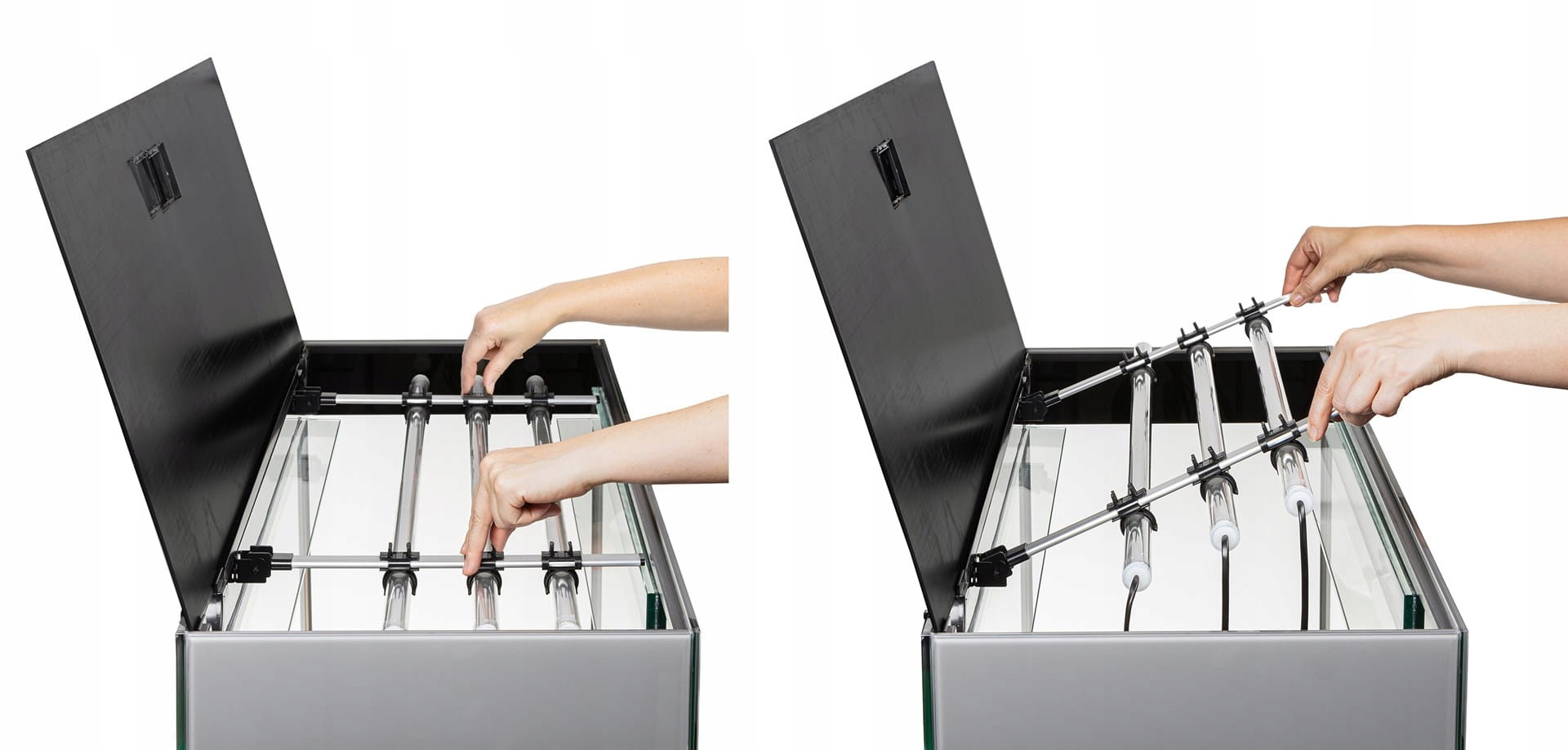 Акваріум із комплекту Glossy має вбудовану кришку та підсвічування Aquael Leddy Tube Sunny Day&Night 2.0. Світлові модулі кріпляться на спеціальній рамі, так що при необхідності доступу до внутрішньої частини акваріума кришка і ручка піднімаються і ставляться вертикально на задню стінку. Таке рішення дозволяє спрямувати освітлення всередину резервуара, щоб всі роботи з обслуговування в акваріумі могли проводитися при повному освітленні. Крім того, кришка акваріума оснащена зручним віконцем, яке дозволяє щодня годувати риб, не відкриваючи її повністю.