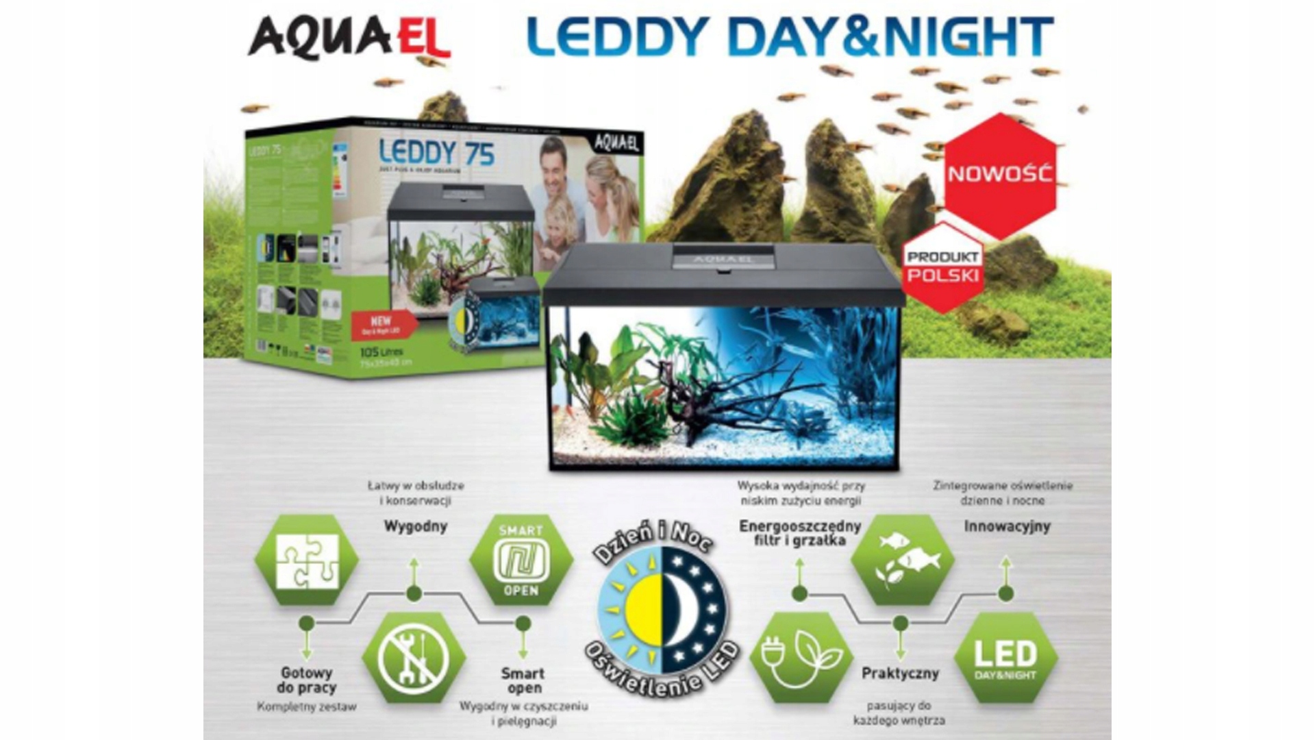 Aquael Leddy Day & Night 25l це повний акваріумний набір від польського виробника. Складається з якісного акваріума з кришкою з денним і нічним освітленням. У набір входить необхідне обладнання для запуску акваріума: нагрівач 25 Вт і фільтр Aquael ASAP 300.