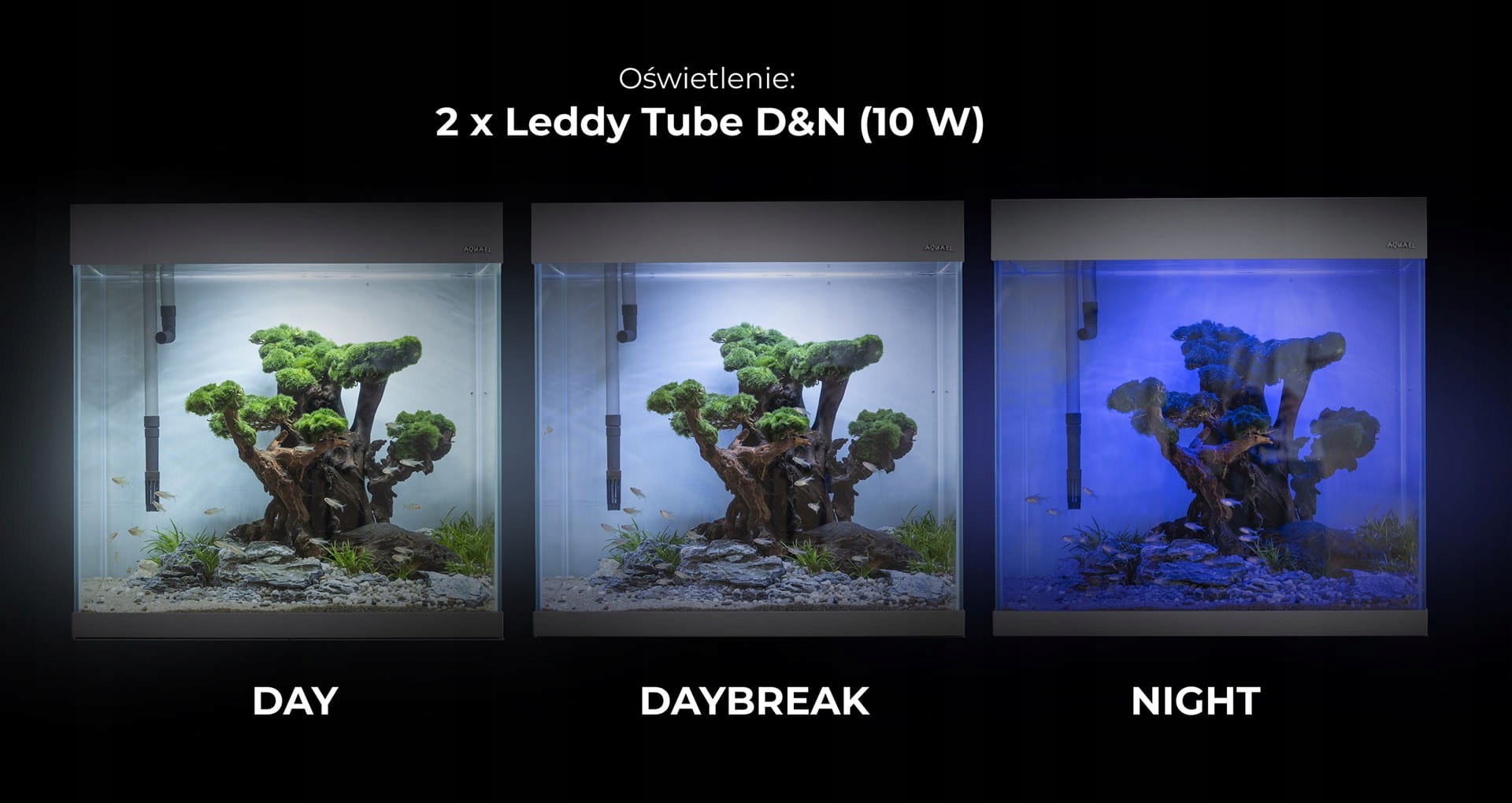 Денний режим імітує сонячне світло, що ідеально імітує природні умови та підтримує ріст рослин. Режим Daybreak — це м’яке світло, яке створює правильну атмосферу в акваріумі ввечері місячне світло і дозволяє спостерігати за життям риб вночі. Однак, якщо цього вимагає ваше розташування, ви можете замінити люмінесцентні лампи іншими з широкого асортименту Leddy Tube. Наприклад, використовуйте Plant, якщо у вас є рослинний акваріум, або Marine Day&Night, якщо ви мрієте про морський акваріум у цьому наборі.