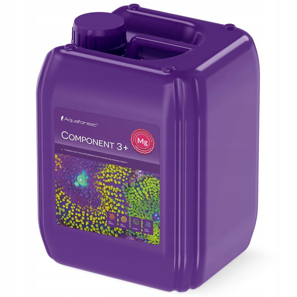 Aquaforest Component 3+ - це рішення, розроблене для підвищення рівня магнію мг в акваріумах рифів. Необхідно в процесі зростання коралів LPS та SPS. також містить сіль без солі, калію та бору . Підготовка готова до використання та проста доза завдяки зручному 5L.