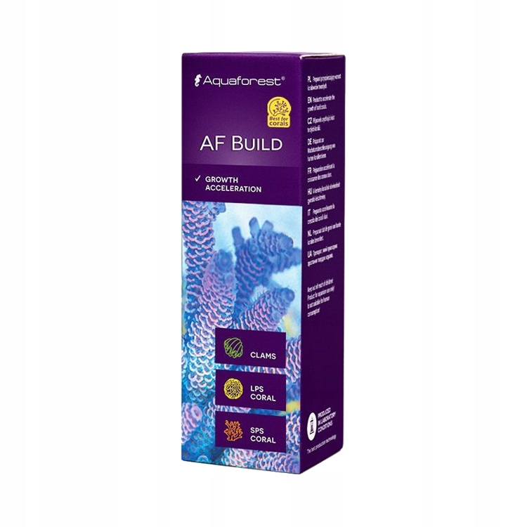 Build прискорює засвоєння кальцію і вуглецю, необхідних для побудови твердих коралів. Забезпечуючи корали необхідними інгредієнтами, він полегшує і прискорює кальцифікацію, позитивно впливаючи на швидкість росту коралів. Крім того, AF Build підвищує рівень pH в рифових акваріумах. Підтримуючи pH на належному постійному рівні, він додатково сприяє прискоренню росту коралів. Тривалі відхилення pH від норми призводять до погіршення кальцифікації та пригнічення росту вапняних водоростей, а в крайніх випадках можуть повністю зупинити процес кальцифікації. Використання AF Build запобігає несприятливим коливанням рН, а шляхом балансування параметрів в акваріумі покращує прозорість води та підтримує ріст коралів. Завдяки своїм властивостям AF Build зменшує кількість нижчих водоростей і пригнічує розвиток патогенних ціанобактерій. Розкладається їжа може бути однією з причин зниження pH, тому AF Build слід використовувати при інтенсивному годуванні коралів, особливо при використанні високопоживної добавки AF Energy. AF Build містить: йодиди, карбонати, кальцій.