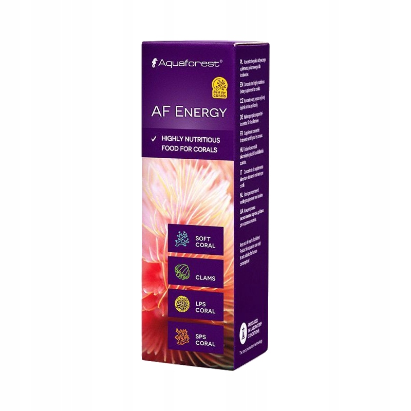 Добавка, що містить концентрат високопоживної їжі, призначений для всіх типів коралів, з особливим акцентом на SPS корали. AF Energy - це унікальна композиція найцінніших природних екстрактів. Містить ненасичені жирні кислоти з груп Омега-3 і Омега-6, а також вітаміни і амінокислоти. AF Energy містить натуральний екстракт спеціально відібраного зоопланктону. Обмежуючи розвиток зооксантел, він посилює світле, пастельний колір коралів SPS. AF Energy збагачена додаванням мідного купоросу, необхідного коралам для правильного розвитку та інтенсивного забарвлення. Вміст мідного купоросу в продукті практично не визначається і абсолютно безпечний для всіх морських організмів. Через кислу реакцію AF Energy ми рекомендуємо використовувати AF Build в той же день для стабілізації pH.