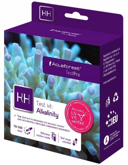 У морському акваріумі дуже важливо постійно контролювати концентрацію кальцію, магнію та карбонатну жорсткість (він же лужність). Рекомендований рівень KH в морському акваріумі становить 6,5 – 8,0 dKH. Тесту достатньо для проведення 78-100 визначень карбонатної жорсткості в акваріумі в діапазоні, зазначеному в таблиці.