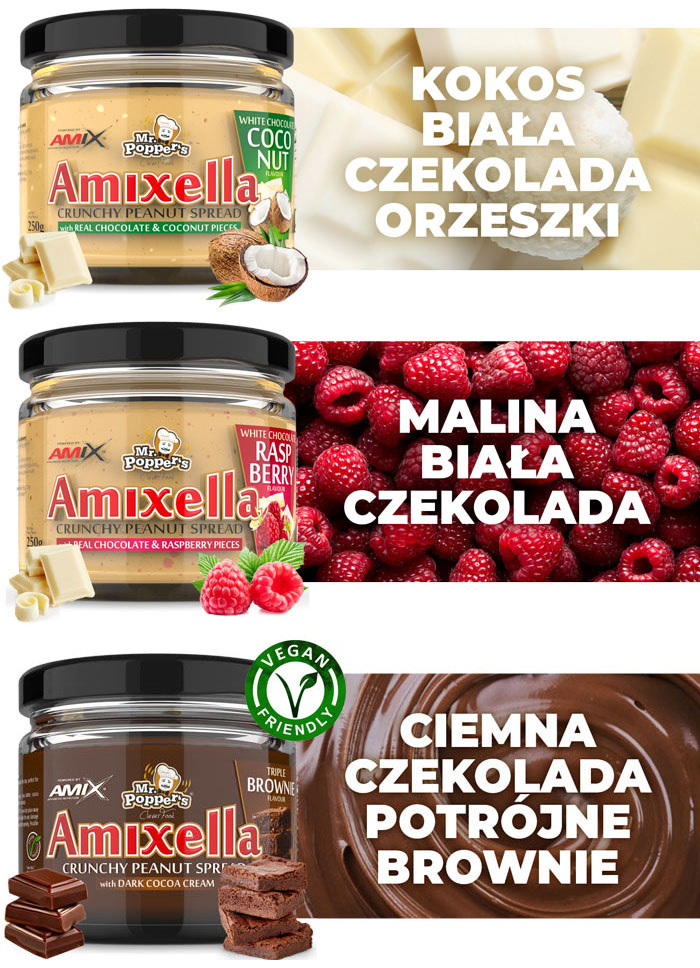 Арахісове масло є одним із найбільш універсальних продуктів на кухні. Використовуючи Amixella зі смаком білого шоколаду та малини, можна приготувати швидкі закуски (наприклад, з крекерами) та поживні коктейлі. Вершкове масло можна використовувати для приготування начинки для омлетів, млинців або домашніх десертів. Амікселла також буде використовуватися як доповнення до домашнього печива, батончиків, тістечок та іншої випічки. І звісно – ви можете їсти арахісове масло ложкою, прямо з упаковки!