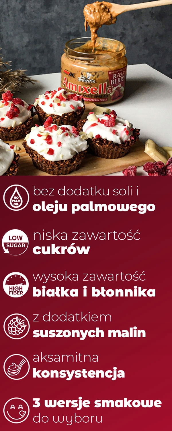 Поєднання оксамитового білого шоколаду з солодкою та освіжаючою малиною змусить вас закохатися в наше нове арахісове масло з першої ложки! Аміксела з малиною та білим шоколадом тане в роті. Масло має однорідну консистенцію та легко розтікається. Це ідеальна альтернатива традиційним кремам – не містить пальмової олії та має високий вміст білка – 20 г на 100 г продукту.