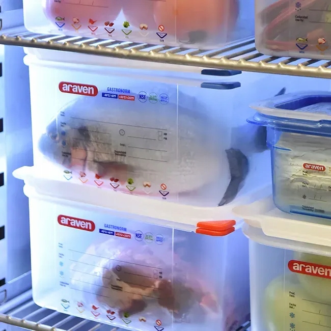 Завжди вибирайте відповідний розмір контейнера Araven GastroNorm залежно від інгредієнта, який ви зберігаєте. Чим більше продукту в контейнері, тим менше кисню може потрапити в нього.