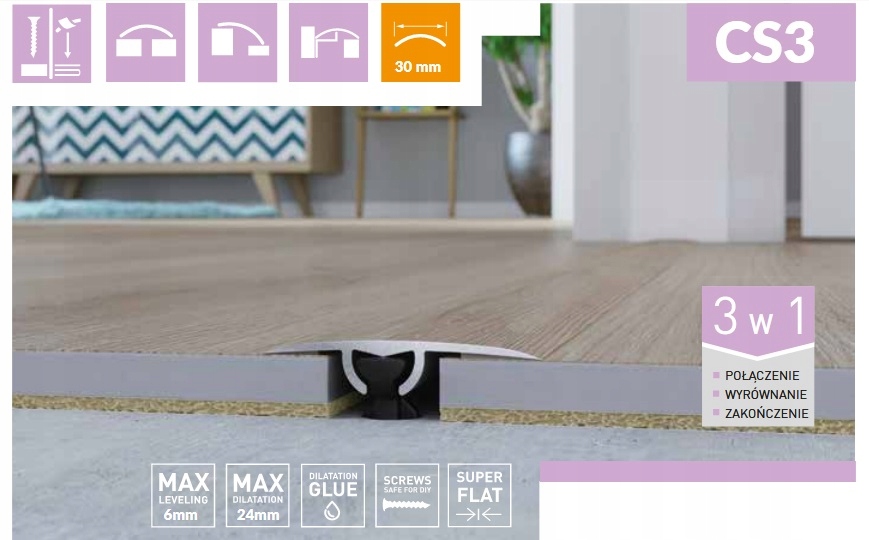 Поріжок алюмінієвий CS3 (перехідний) шириною 30 мм кріпиться за допомогою клею (2 смужки стрічки по довгому краю) або спеціального монтажного цвяха, який врізається в напрямну планки цвяхом відповідного розміру. відстань, потім забивається разом зі смугою в отвір, просвердлений свердлом 6 мм - спосіб монтажу абсолютно непомітний. Завдяки ширині 30 мм смугу CS3 можна використовувати для з’єднання поверхонь на рівних і нерівних рівнях (різниця між нерівними рівнями до 6 мм). Планка CS3 також може використовуватися як кінцева планка для підлогових покриттів товщиною 4-22 мм. Смуга CS1 має довжину 930 мм, але можна з’єднати кілька смуг разом за допомогою з’єднувача, що входить до смуги.