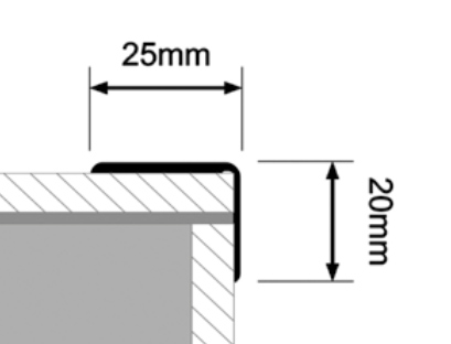 Алюмінієвий сходовий кутник з розміром плеча 25 мм на 20 мм має рифлену (антиковзку) поверхню, стійку до стирання. Сходовий кутник приклеюється до основи за допомогою двох рядів надміцного клею на основі силікону (попередньо нанесеного на нижню частину планки). Сходові кутники мають подвійне призначення: практичне і декоративне. Щоб найкраще реалізувати свої практичні властивості та бути довговічними, вони виготовлені з високоякісного алюмінію. На кутник нанесений силіконовий клей, який усуває ефект розтріскування та захищає поверхню швів від вологи та бруду. Він доступний довжиною 2400 мм і 1200 мм.