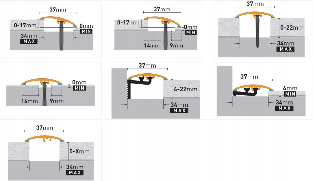 Поріжок алюмінієвий CS1 (перехідний) шириною 37 мм кріпиться на клей (2 смуги скотча по довгому краю ) або за допомогою спеціального цвяхового вузла, який встановлюється в напрямну стрічки з відповідним чином виміряною відстанню між цвяхами, а потім разом із стрічкою вбивається в отвір, просвердлений свердлом діаметром 6 мм - спосіб встановлення абсолютно непомітний. Завдяки ширині 37 мм планку CS1 можна використовувати для з’єднання поверхонь на рівних і нерівних рівнях (різниця між нерівними рівнями до 17 мм). Планка CS1 також може використовуватися як торцева планка для підлогових покриттів товщиною 4-22 мм. Смуга CS1 має довжину 930 мм, але можна з’єднати кілька смуг разом за допомогою з’єднувача, що входить до смуги.