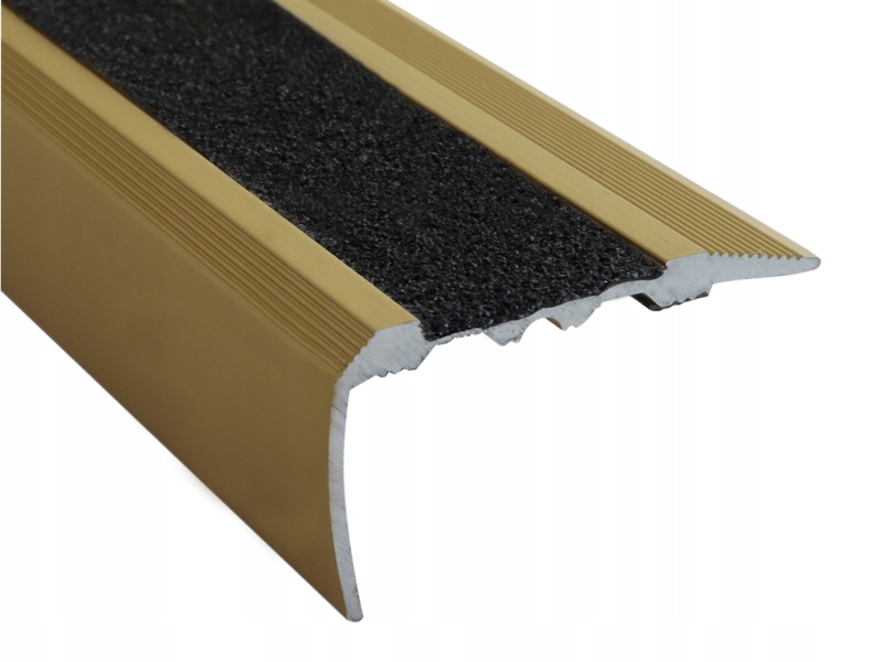 Алюмінієвий сходовий кутник з розмірами плеча 40 мм на 23 мм - світло-золотий колір з чорною протиковзкою вставкою. Сходовий кутник кріпиться шурупом, який загвинчується зверху (в ширшому плечі 40 мм просвердлені отвори), куди необхідно щільно затягнути (притиснути) кутник на сходах. Сходові кутники мають подвійне призначення: практичне і декоративне. Щоб максимально реалізувати свої практичні властивості та бути довговічними, вони виготовлені з високоякісного алюмінію, а кутова вставка є протиковзким елементом. Протиковзка стрічкова вставка також є елементом, який прикриває спосіб монтажу, роблячи його непомітним. Кут оснащений силіконовою прокладкою, яка усуває ефект розтріскування, а також захищає поверхневі з'єднання від вологи та бруду. У комплекті з кутовим кронштейном є монтажні шпильки та гвинти.