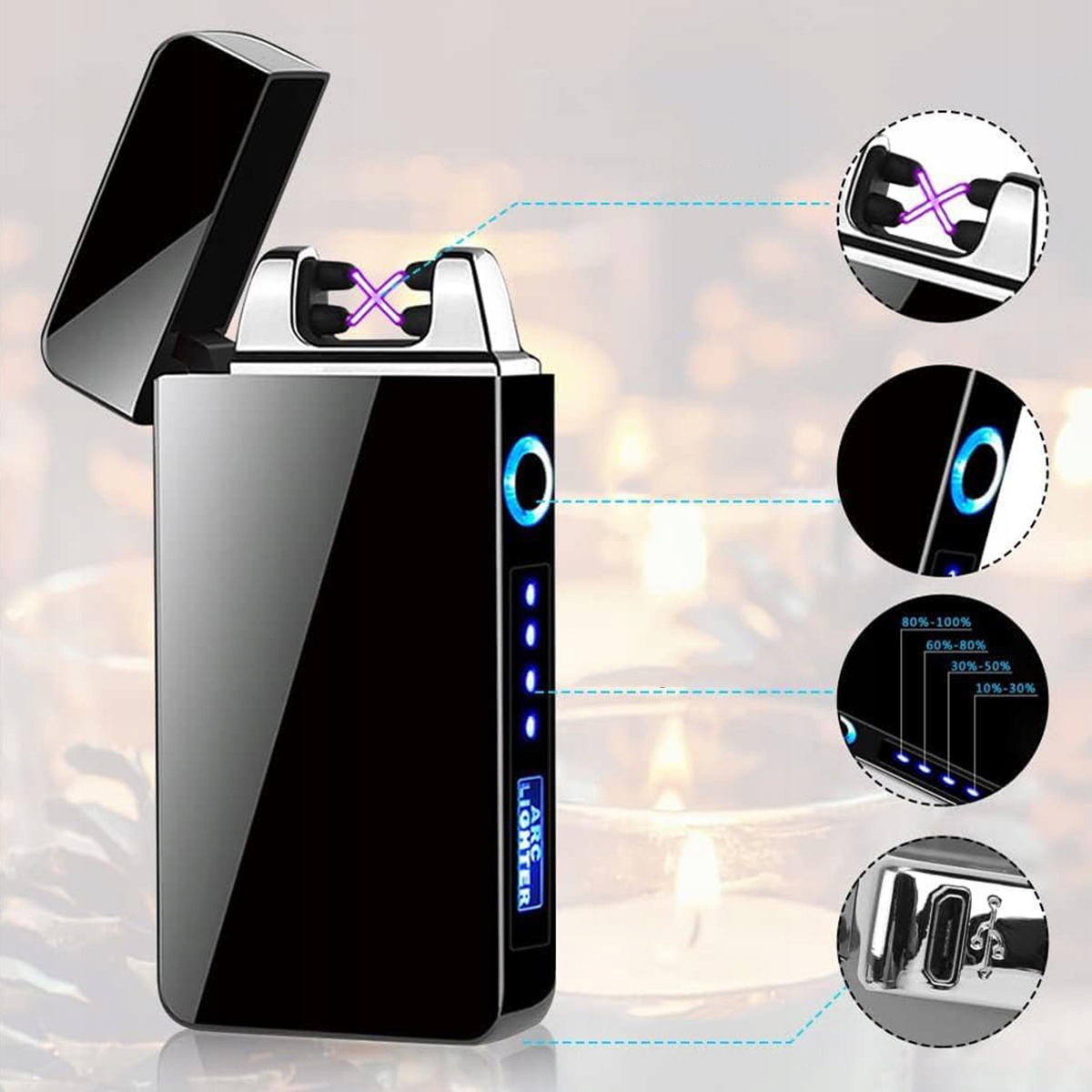 Електронна запальничка USB, світлодіодний сенсорний екран із подвійною дугою та індикатор рівня заряду батареї, вітрозахист, плазма, подарунок для чоловіків і жінок