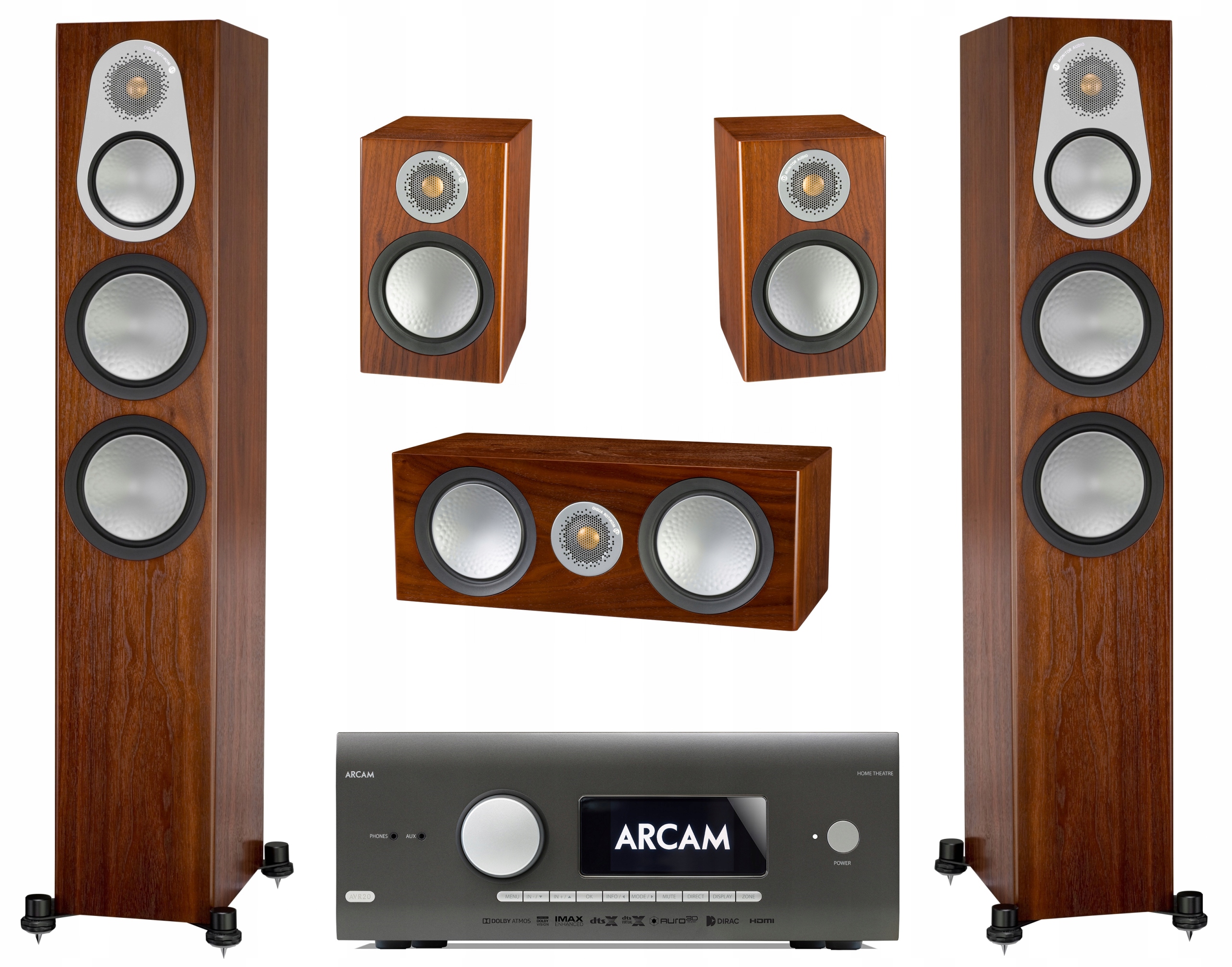 Monitor Audio Silver 6G, колір горіх/горіх - набір для домашнього кінотеатру 5.0 + верхній ресивер Arcam AVR20, це новий комплект для домашнього кінотеатру найвищого класу, у фабричній упаковці.