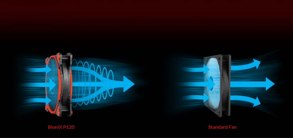 Під час розробки нового BioniX P120 особлива увага приділялася концентрованому потоку повітря, а отже, високому статичному тиску. Вентилятор гарантує виключно ефективне охолодження навіть при підвищеному опорі повітря. Тому BioniX P120 особливо підходить для використання на радіаторах.