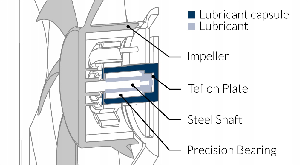 Завдяки комбінації сплаву та мастила, розробленій у Німеччині, тертя в підшипнику зменшено, що сприяє підвищенню ефективності. Це генерує менше тепла, зменшує шум підшипників і подовжує термін служби вентилятора.