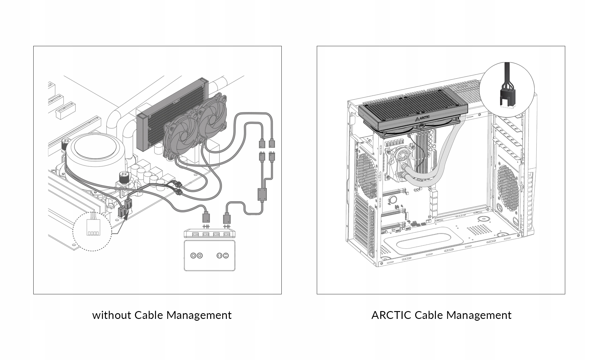 Крім того, він приховує кабелі RGB і PWM вентиляторів радіатора завдяки розумній системі організації кабелів. Таким чином вам потрібно лише підключити два штекери до материнської плати та заощадити дорогоцінний час під час встановлення. Нарешті, вам більше не потрібно ховати кабелі, а ваш огляд обмежено необхідним.
