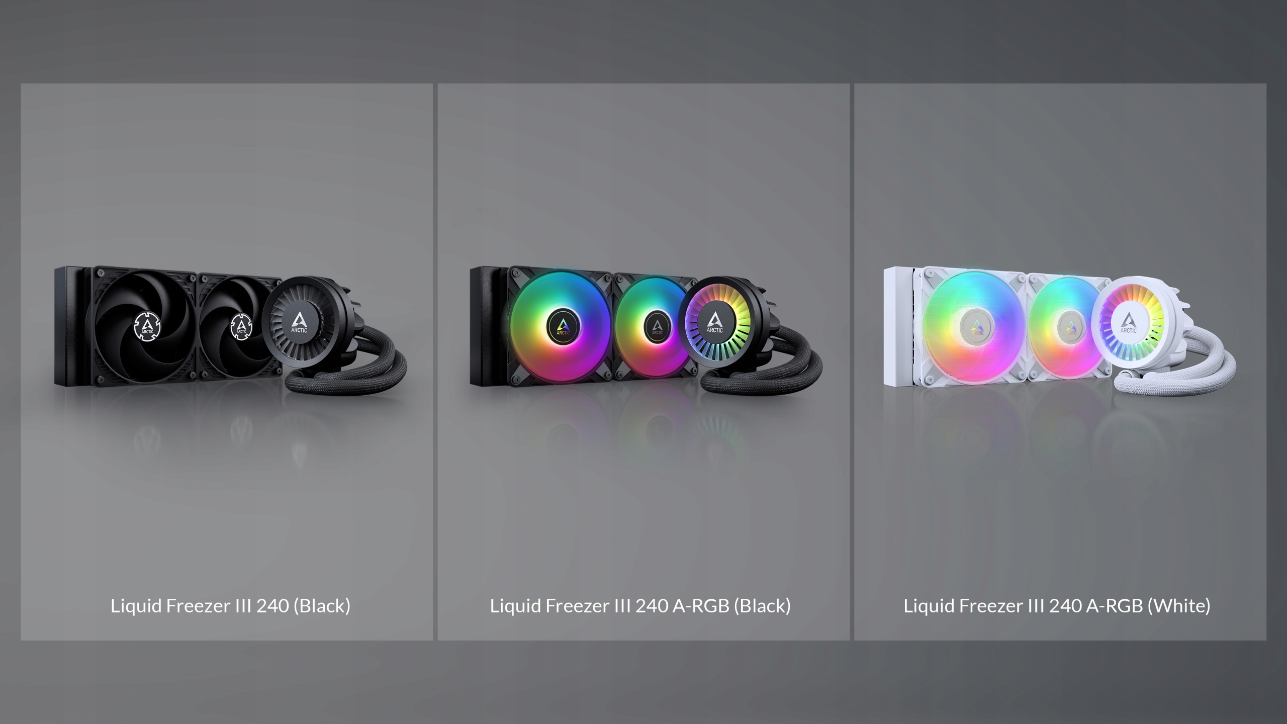 Liquid Freezer III пропонує виняткову ефективність охолодження в чотирьох різних розмірах і трьох варіантах. У той час як чорна версія повністю чорна, версії A-RGB доступні в чорному або білому кольорі та мають цифрове адресне освітлення для головки насоса та вентиляторів радіатора. З радіаторами розмірів 240, 360, 280 і 420, Liquid Freezer III пропонує ідеальне поєднання продуктивності, технології та дизайну для кожного!