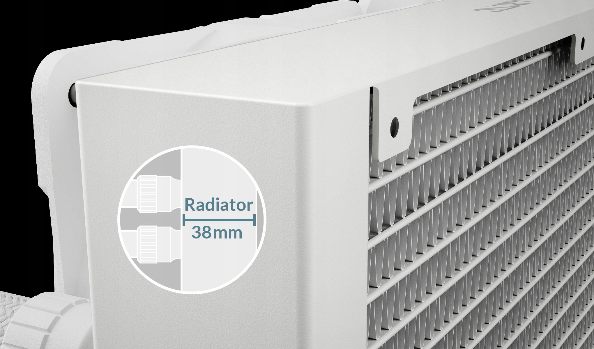 Поверхню охолодження радіатора товщиною 38 мм було збільшено на 23% завдяки збільшенню пакета ребер. Це забезпечує не тільки кращу тепловіддачу, але й більший об’єм рідини. У результаті накопичення тепла в системі водяного охолодження сповільнюється, а піки потужності та температури можна ефективно контролювати протягом довших періодів часу.