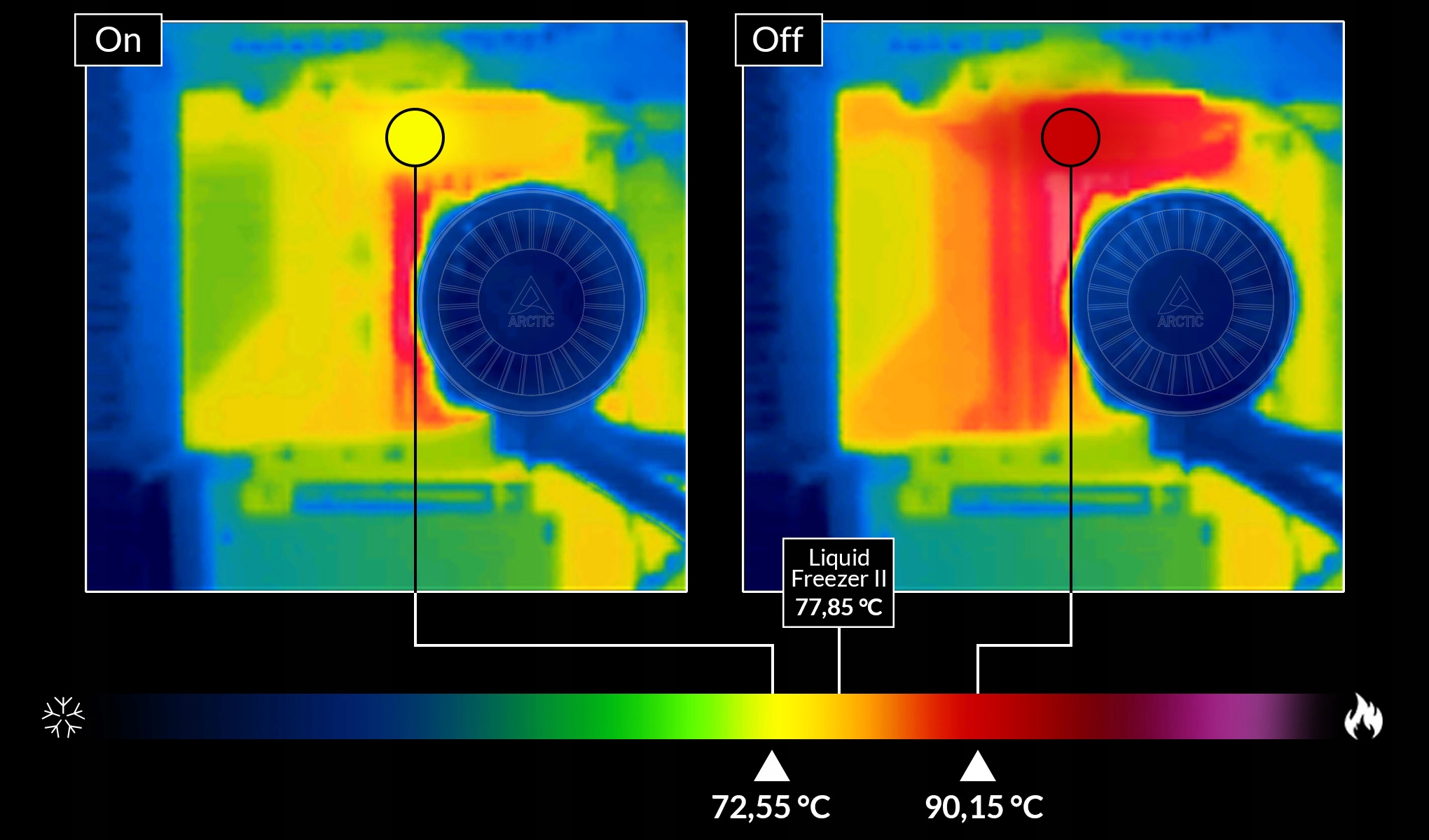 Перетворювачі напруги на материнських платах часто працюють при максимальних температурах у поєднанні з енергоємними процесорами. Щоб компенсувати відсутність потоку повітря з баштового охолоджувача, Liquid Freezer III працює з переробленим вентилятором VRM. 60-міліметровий вентилятор із ШІМ-регулюванням забезпечує майже безшумне охолодження області роз’єму, коли охолодження VRM недостатнє, у випадках поганого повітряного потоку або особливо в сценаріях розгону. Це забезпечує постійно вищі навантаження та довший термін служби перетворювачів напруги.
