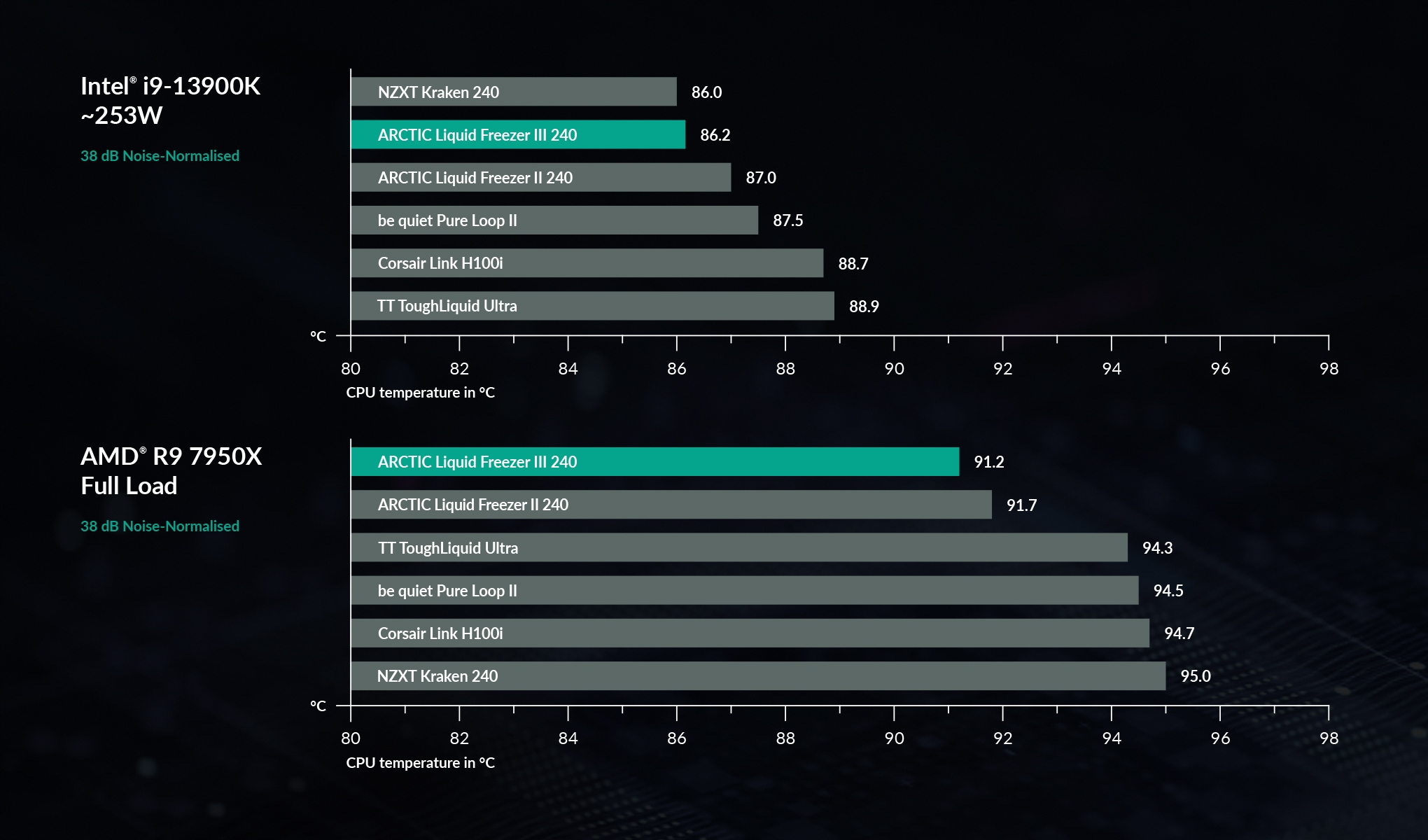 Під час незалежного тестування Liquid Freezer III явно виділяється серед конкурентів у всіх цінових категоріях, особливо завдяки своїй винятковій продуктивності. У стандартизованих тестах на рівень шуму Liquid Freezer III демонструє свою справжню силу, перевершуючи багатьох конкурентів своєю тихою, але потужною роботою.