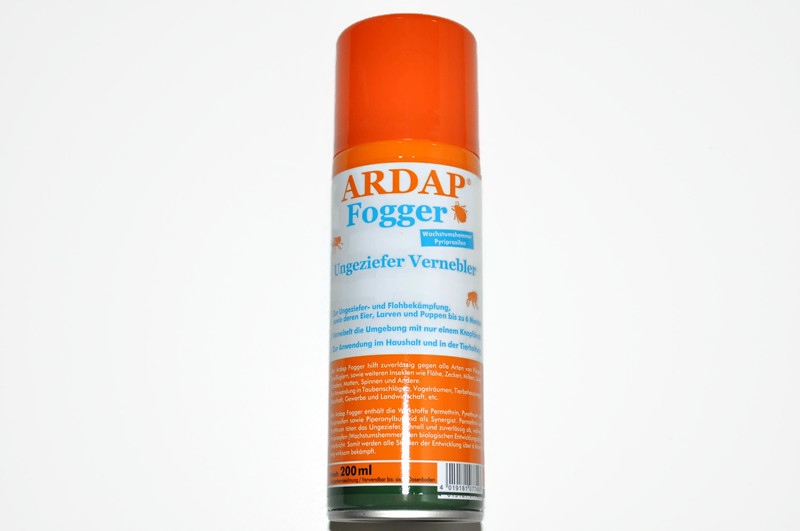 Ardap Fogger надійно бореться з усіма типами мух, а також інших комах, таких як кліщі, кліщі, воші, таргани, молі, павуки та інші. Для використання в горищах, пташиних кімнатах, кімнатах для тварин, домогосподарств, компаній та сільського господарства. Ardap Fogger містить діючі інгредієнти перметину, золота та пірироксифену, а також трубононіл бутанолану як синергетичного. Перметрин і Злоцієні вбивають шкідників швидко та надійно, тоді як піпрофен (інгібітор росту) перериває цикл біологічного розвитку. Таким чином, всі етапи розвитку протягом понад 6 місяців ефективно ведуться. Щоб зупинити життєвий цикл бліх і, таким чином, позбутися бліх у довгостроковій перспективі, важливо лікувати як навколишнє середовище, так і саму тварину. Рекомендується використовувати ARDAP з довгими бліхами, особливо в кошику або в улюблених місцях собаки. У той же час, ви також повинні лікувати домашнього улюбленця, щоб спочатку запобігти зараженню. Наприклад, спеціальні коміри, спреї або шампуні Ardap стримують блоху через діючу речовину золота. Кнопка шайби натискається, поки вона не стрибне на своє місце. Вийдіть з кімнати на 2 години і закрийте двері. Потім провітрюйте принаймні годину. Вміст Fogger Ardap спорожняється протягом декількох хвилин. Банки 200 мл достатньо при 60м2. Середні покриття на поверхнях, які більше не потрібні, можна видалити шляхом контрабанди універсальних засобів для чищення, доступних у торгівлі водою. Підготовка та запобіжні заходи: домашні тварини (собаки, декоративні птахи, голуби, маленькі тварини) тримаються подалі від 2 годин після обприскування. Закрийте всі зовнішні двері та вікна. Покрівання акваріумів та тераріумів. Вимкніть датчики диму, оскільки вони можуть почати. Вентиляція виставкових залів. Видаліть усі джерела запалювання. Видаліть напої, їжу, тваринну їжу та столові прилади.