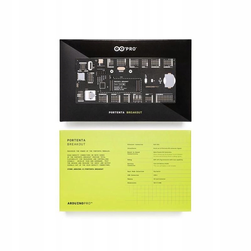 Плата розширення Arduino Portenta Breakout є незамінним інструментом у процесі створення прототипів і тестування з’єднань. Збільшує можливості Arduino Pro Portenta H7. Він оснащений роз’ємами USB типу A, RJ45, слотом для карти micro SD і слотом для батареї для RTC (годинника реального часу). Завдяки комплексній розпіновці всіх контактів плати Portenta можна отримати доступ до різноманітних інтерфейсів.