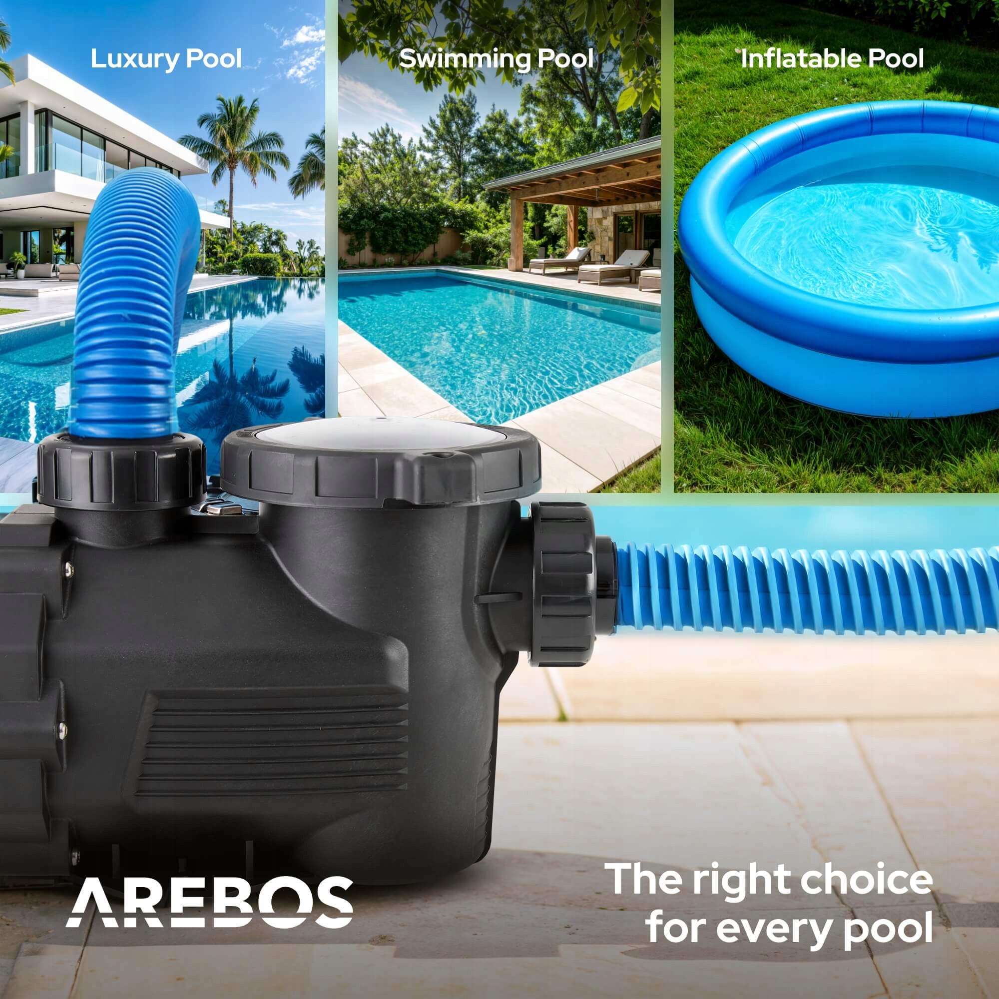 Завдяки стандартизованим з'єднанням 50/38 мм, насос Arebos може бути легко підключений до багатьох популярних систем пулу. Його корисність як для свіжої, так і для морської води робить її особливо універсальною - будь то в садовий басейн, чи до Слононо.