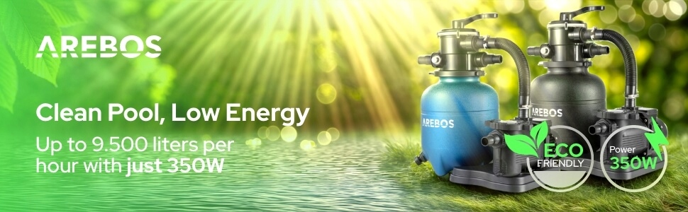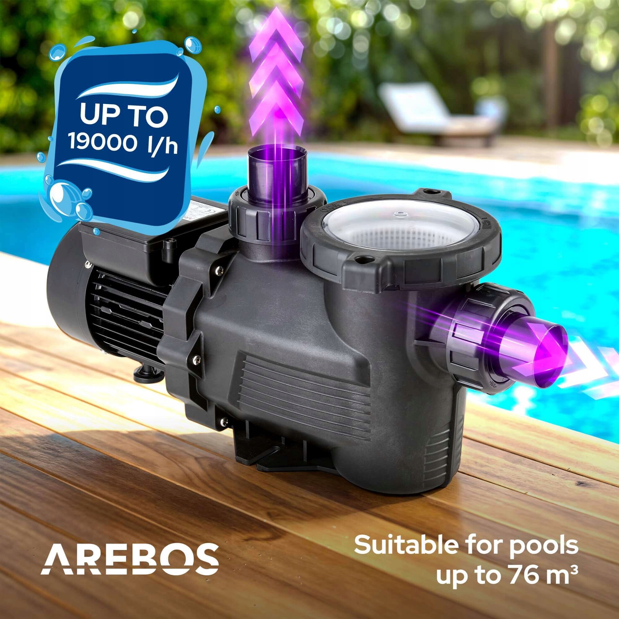 Завдяки вихідній потужності 800 Вт та максимального потоку 19000 літрів на годину, насос басейну Arebos забезпечує сильну та надійну циркуляцію води в басейні. Ідеально підходить для басейнів з площею до 76 м³ - для незмінно чистої та гігієнічної води.