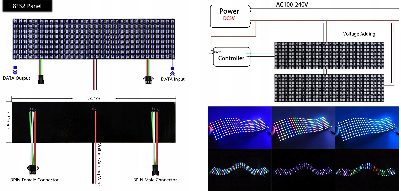- Ланцюг і гнучкий дизайн. Панель можна розширити, підключивши її по одному до 3-контактних роз’ємів JST. Гнучкі FPCB можна згинати та згинати навколо поверхонь.