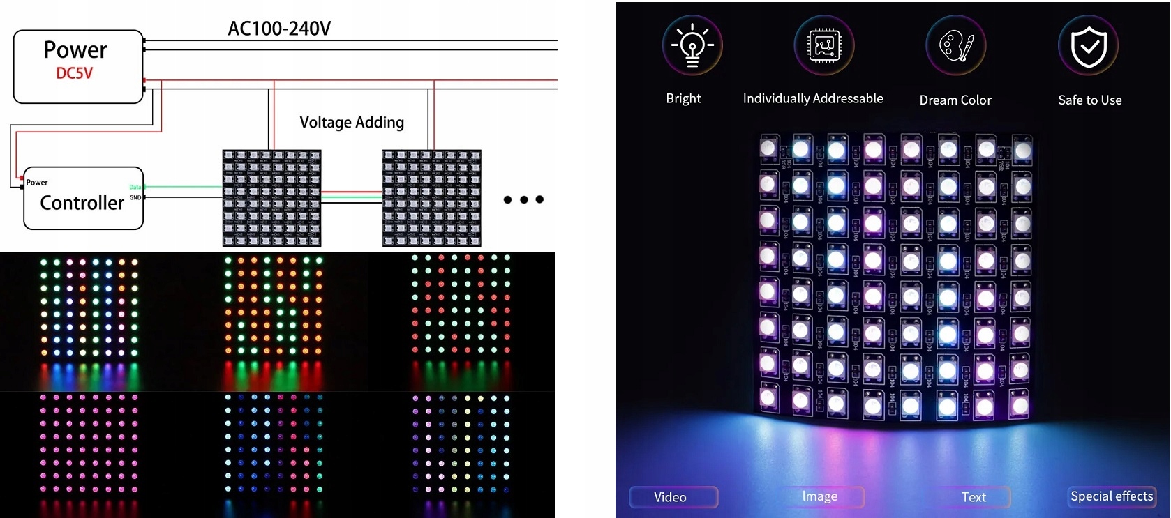matryca - панель WS2812b 8 x 8 см. Одиночні пікселі, загалом 64 пікселі, цифрова гнучка світлодіодна панель, повні яскраві кольори, DC5 освітлення V