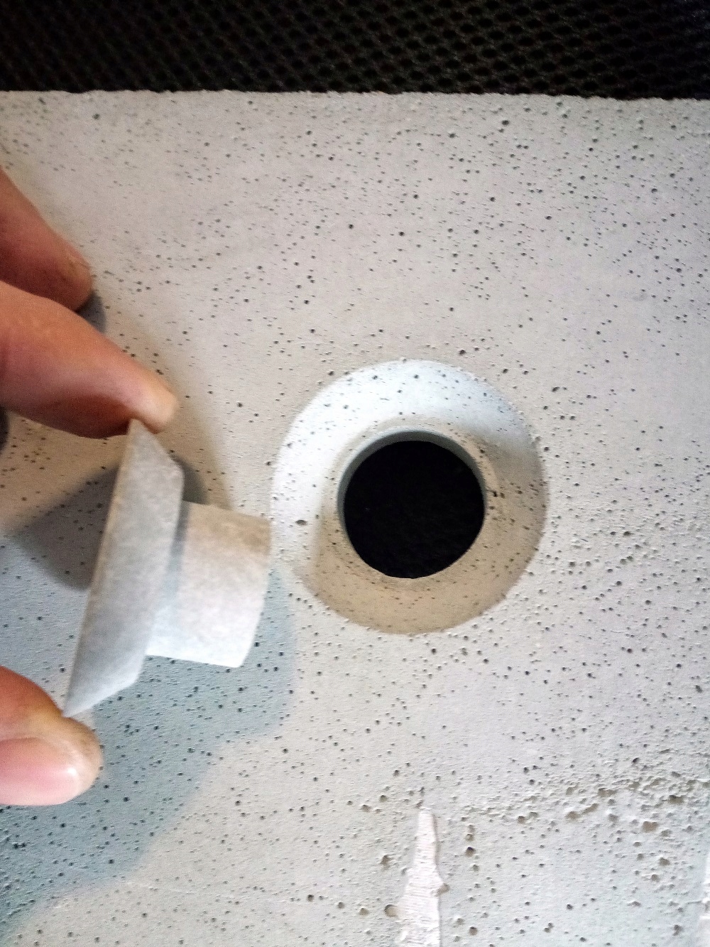 Бетонна пробка вклеюється в отвір для стяжки за допомогою клею, епоксидної смоли або хімічного анкера. Для отримання герметичності. Для отримання кращого візуального ефекту використовуємо бетонний конус. Такий конус, уже вклеєний, також гарантує додаткову герметичність (запобігає протіканню на зовнішню сторону бетонної та пластикової труби). Під час склеювання поверніть дюбель на 180°, щоб клей рівномірно розподілився.