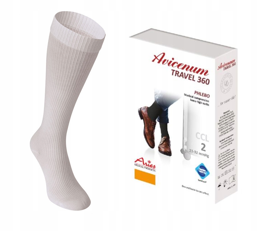 Овен Avicenum Phlebo 360 Подорож - це медичні пристрої стиснення 2 -го класу класу стиснення (CCL 2). Вони призначені для використання як у домашніх, так і в медичних закладах. Вони присвячені комрійотерапії, що застосовується у венозних судинах та набряку різних походження нижніх кінцівок. Вони зберігають свою ефективність та безпеку протягом 6 місяців від першого використання, дотримуючись правил їх догляду та зберігання.