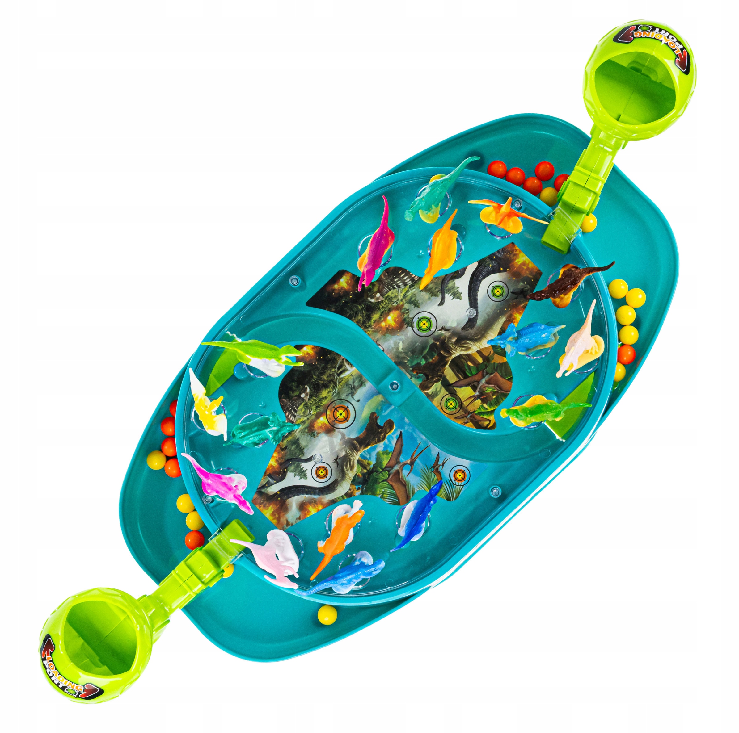 Дошка має кришку, яка запобігає випаданню куль під час ударів. Динозаври та м’ячі мають різні кольори, щоб гра пройшла гладко.