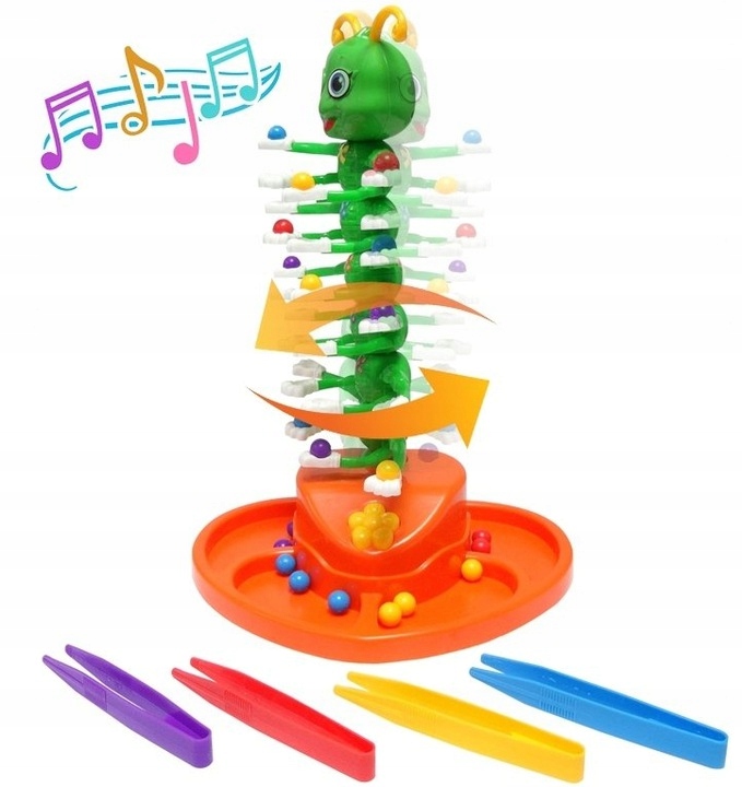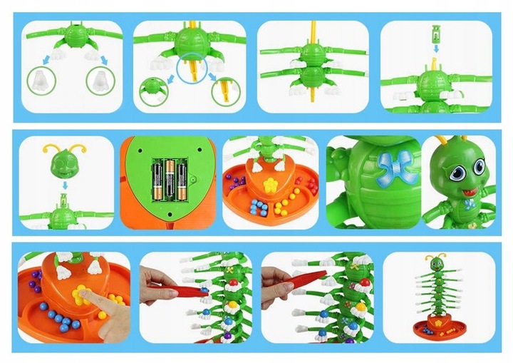 - Завдання кожного гравця полягає в тому, щоб поставити всі свої м’ячі на ноги гусениці – і за найкоротший час (ви можете зробити це за допомогою пінцета, що додається, або традиційно рукою),