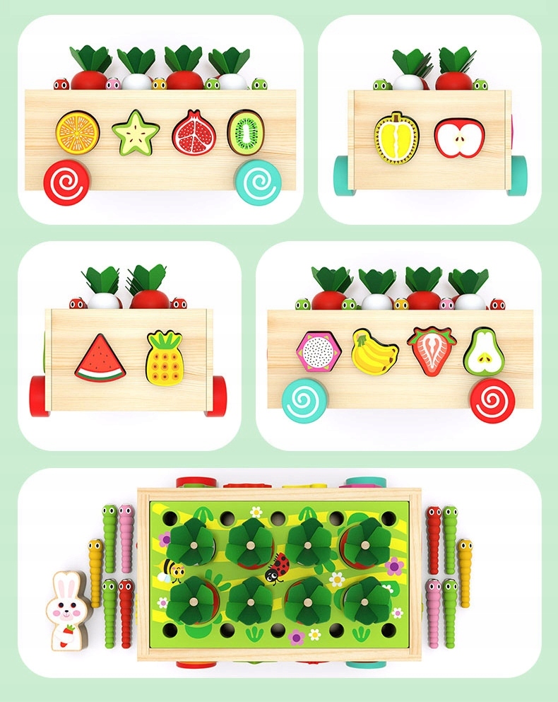 ⭐Крім того, з боків цього сортера є отвори для різноманітних фруктів та овочів, які викликають у дитини бажання підбирати відповідний фрукт чи овоч у потрібне місце. Одночасно ми можемо навчити дитину назвам овочів і фруктів.