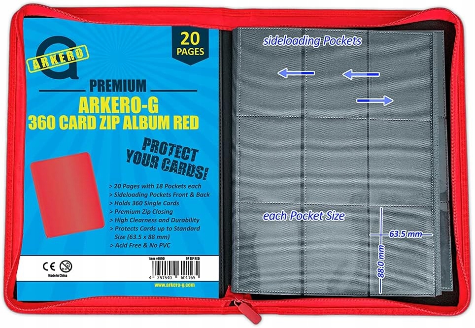 - ? Arkero-G: 18-кишенькова швидкозмінна блискавка червоного кольору. Високоякісний змінний колекційний альбом зі штучної шкіри містить 20 міцно скріплених сторінок, кожна сторінка має 9 кишень спереду та ззаду.