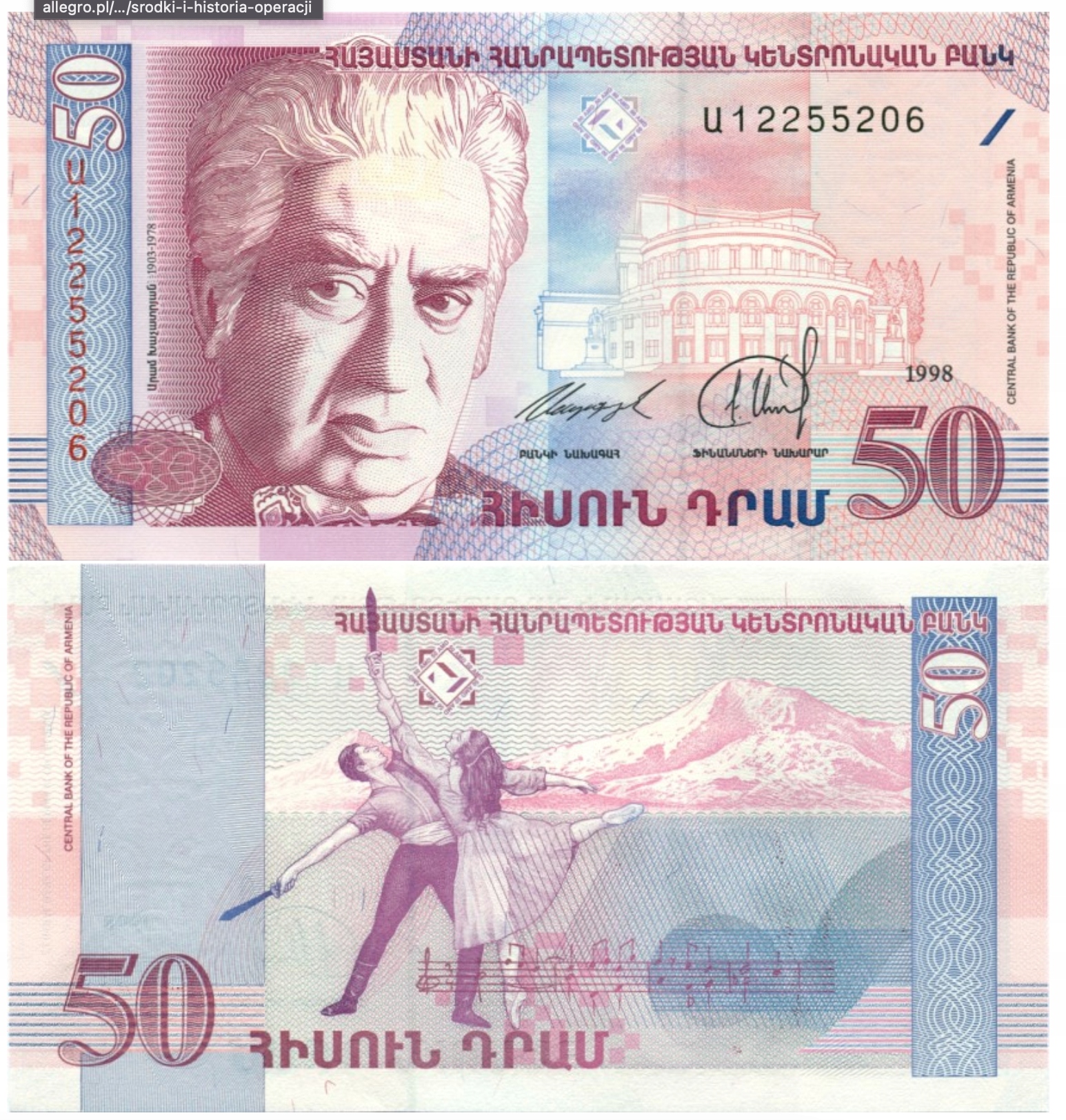 Вірменія 50 DRAM 1998 P-41 UNC, серійний номер банкноти може відрізнятися від зображеного на фото.