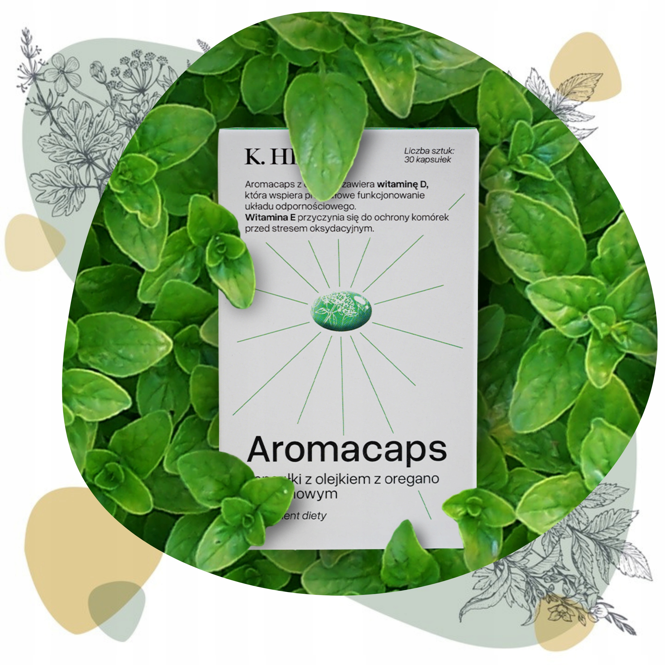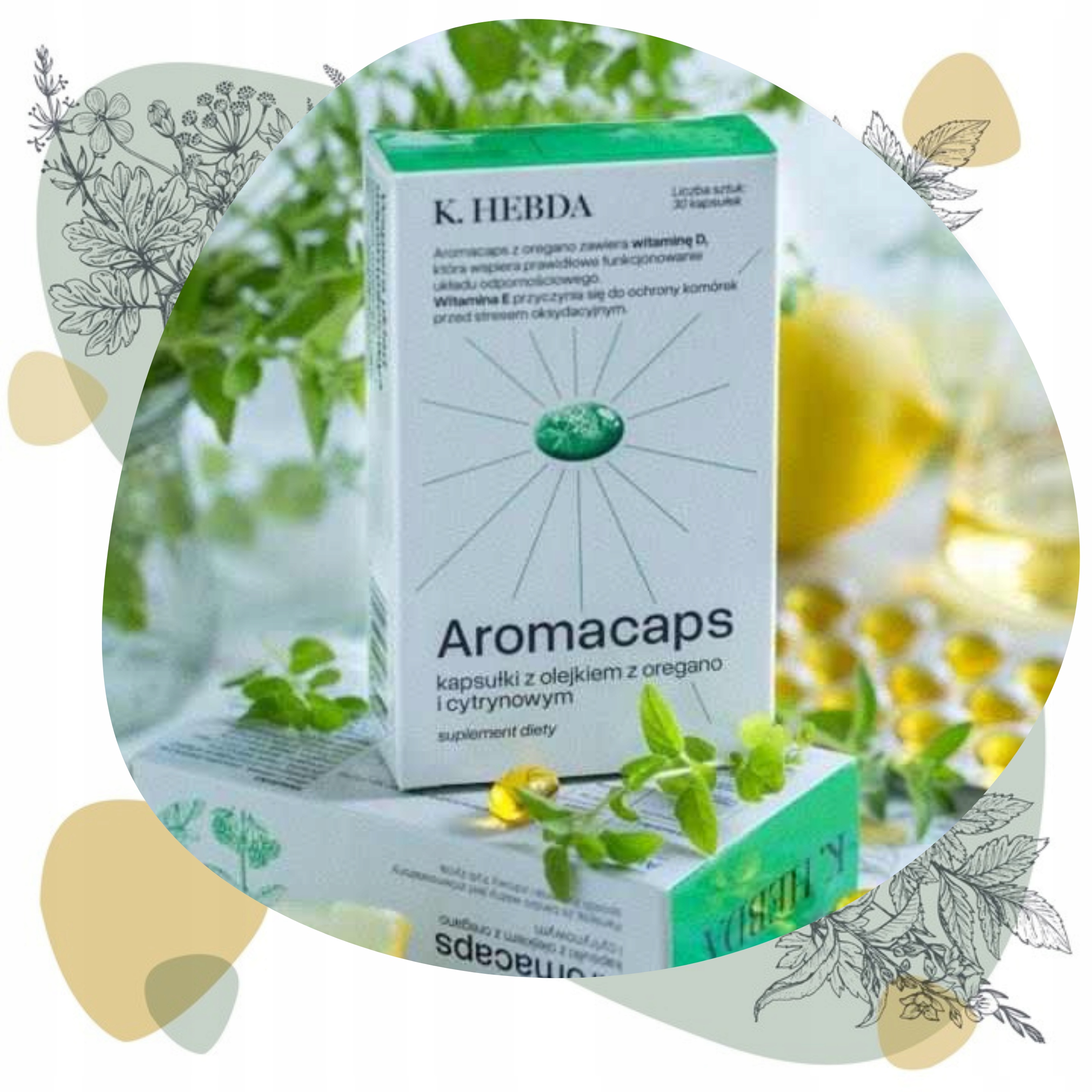 Aromacaps® - це капсули, створені Klaudyna Hebdąaдля людей, які шукають дієтичну добавку з орегано, яка дбайливо впливає на організм і працюватиме протягом тривалого часу. Капсули з олією орегано і лимона підійдуть для підтримки вашого імунітету (вони також містять вітамін D), тому вживати їх варто не лише тоді, коли починаєш почуватися трохи гірше. Ідеально підходить для людей, які також хочуть подбати про комфорт свого травлення. Вони містять оптимальну дозу натуральних екстрактіворегано(майорану звичайного)