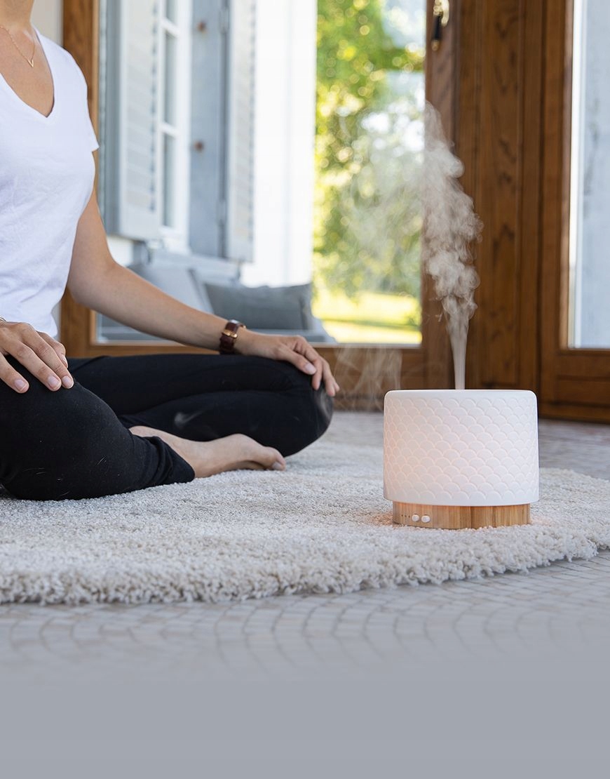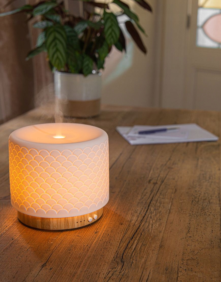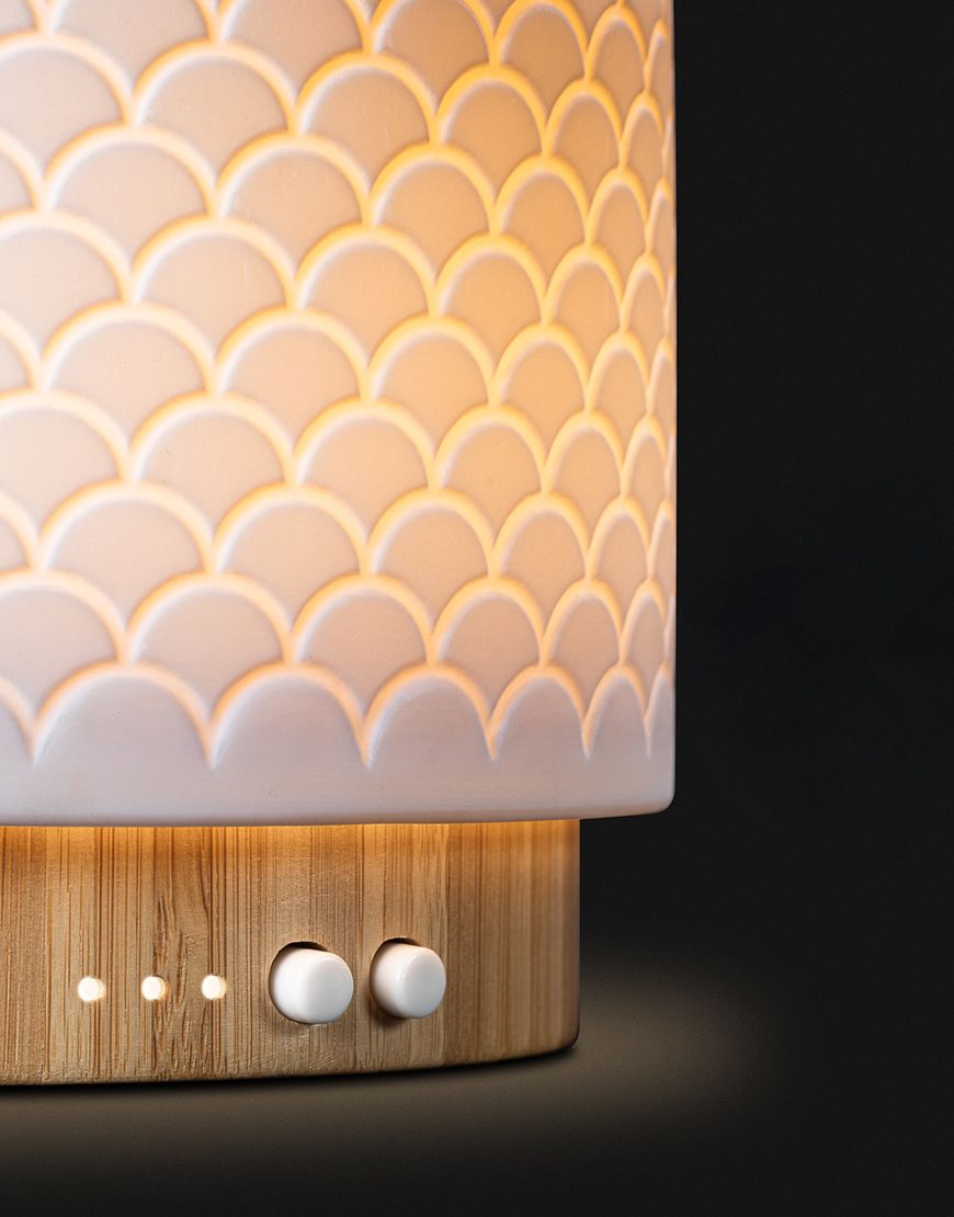 Moya, розміщена у вашому інтер'єрі, запрошує вас заспокоїтися своїм елегантним дизайномта композицією з натуральних матеріалів: бамбук основа та гравірованакерамічнаоболонка. Крім того, незалежно або паралельно з дифузією, Moya випромінює світло біло-помаранчевого відтінку, яке проникає крізь кераміку, створюючи надзвичайно теплу атмосферу.