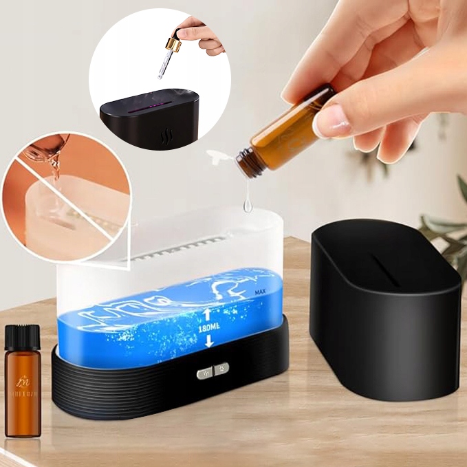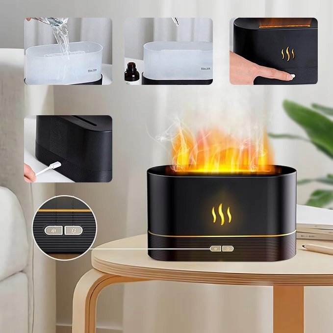 Поєднує барвисті світильники та водяний туман з ультразвуковими коливаннями, щоб імітувати заспокійливий ефект полум'я, додаючи тепло та атмосферу в будь -яку кімнату.