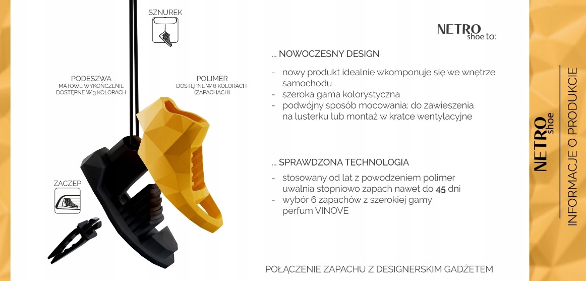 VINOVE - це новий бренд автомобільних парфумів, створений польськими ентузіастами у співпраці з французькими майстрами парфумерії та італійськими дизайнерами та вченими. VINOVE - ексклюзивний автомобільний парфум. Для виробництва автопарфумерії VINOVE використані технології 21 століття. Були використані знання, відкритість і досвід команди вчених, і разом з ними аромати були конденсовані в інноваційний полімер. Їх форма розроблена таким чином, що повітря з вентиляційних отворів автомобіля м'яко обтікає полімерний лабіринт, виділяючи аромат непомітно і довго - до 90 днів. При розробці носія ароматизатора ми враховували насамперед його функціональні цінності: тривале виділення аромату, безпеку для оббивки салону та кабіни автомобіля, а також ексклюзивний зовнішній вигляд, який відповідає стилю сучасних автомобілів.