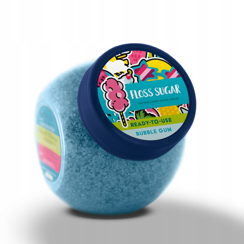 Високоякісний кольоровий блакитний цукровий пісок зі смаком жувальної гумки. Кольорований і ароматизований цукор. Готовий до використання в машинах для виробництва солодкої вати. Також ідеально підходить як добавка до тортів, кремів, хлібобулочних виробів і напоїв.