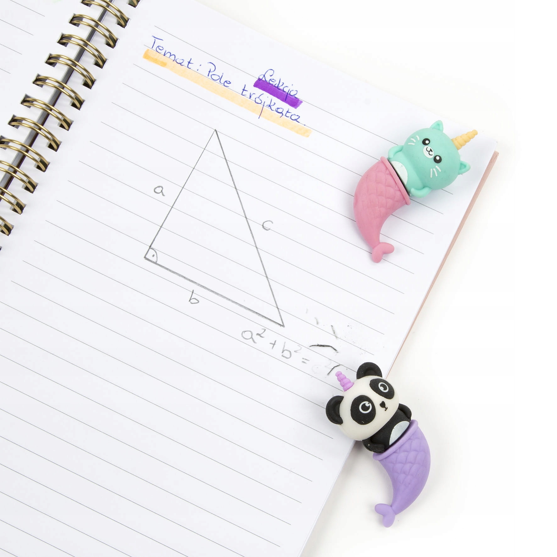Гумки у формі панди-русалки та кішки-русалки, дві, надзвичайно солодкі Запахи: полуниця і карамель. Чудові гумки ретельно стирають олівець і є унікальним доповненням до пеналу. Вони стануть у пригоді на уроках образотворчого мистецтва та математики, а їхній апетитний аромат зробить день у школі приємнішим.