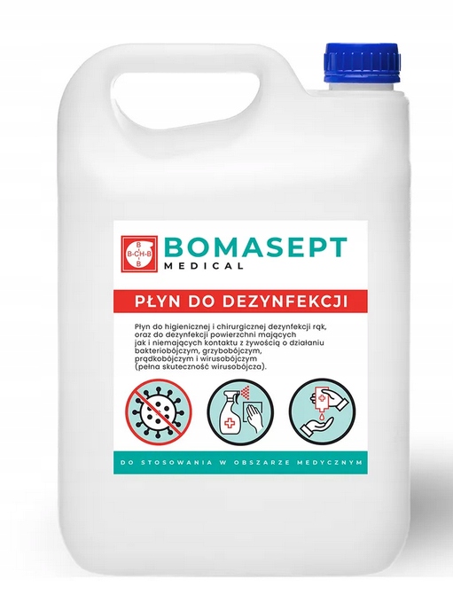 БОМАСЕПТ медичний – універсальна дезінфікуюча рідина на основіетилового спирту для дезінфекціїрук, шкіри та поверхонь. Препарат зареєстрований як біоцидний препарат. Широкий спектр дії, в тому числі проти бактерій, грибків і вірусів. Рідина містить зволожуючі речовини, які захищають шкіру від пересихання. Призначений для приватного та професійного використання (лікарні, офіси, служби). Рідина містить, серед іншого: