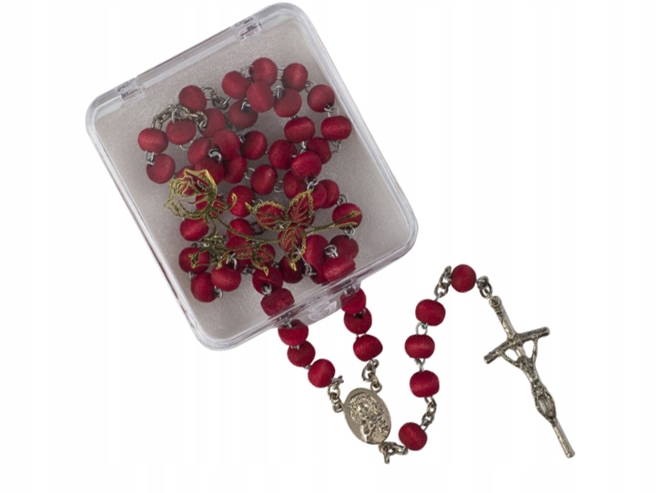 Красиве темно-рожеве мереживо, прикрашене папським хрестом. Намистини розарію були просочені таким чином, щоб вони випромінювали запах троянди.