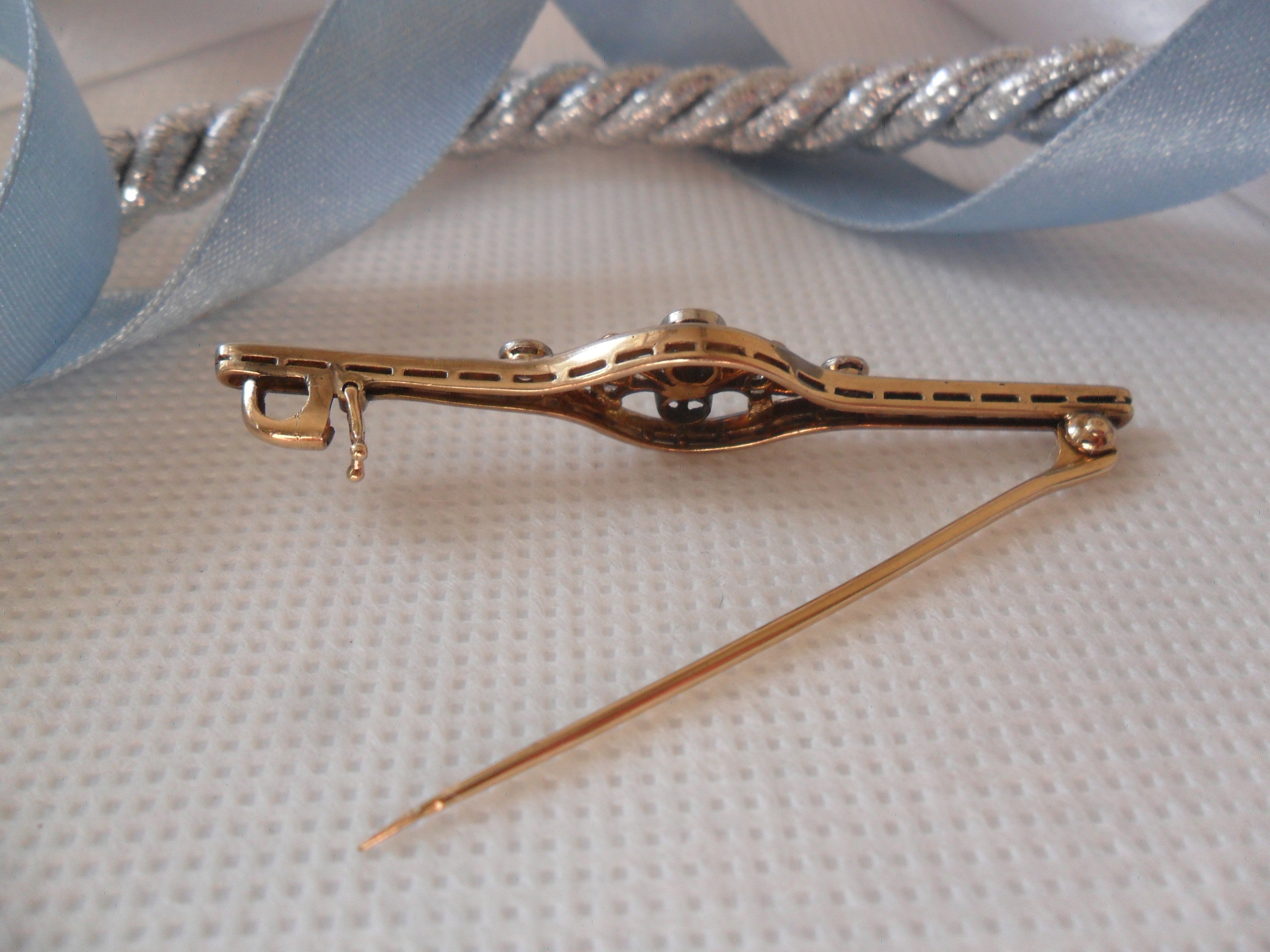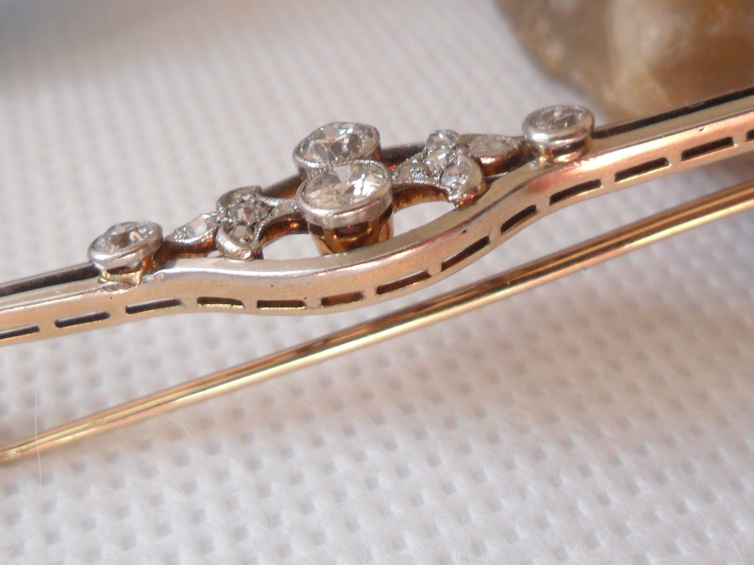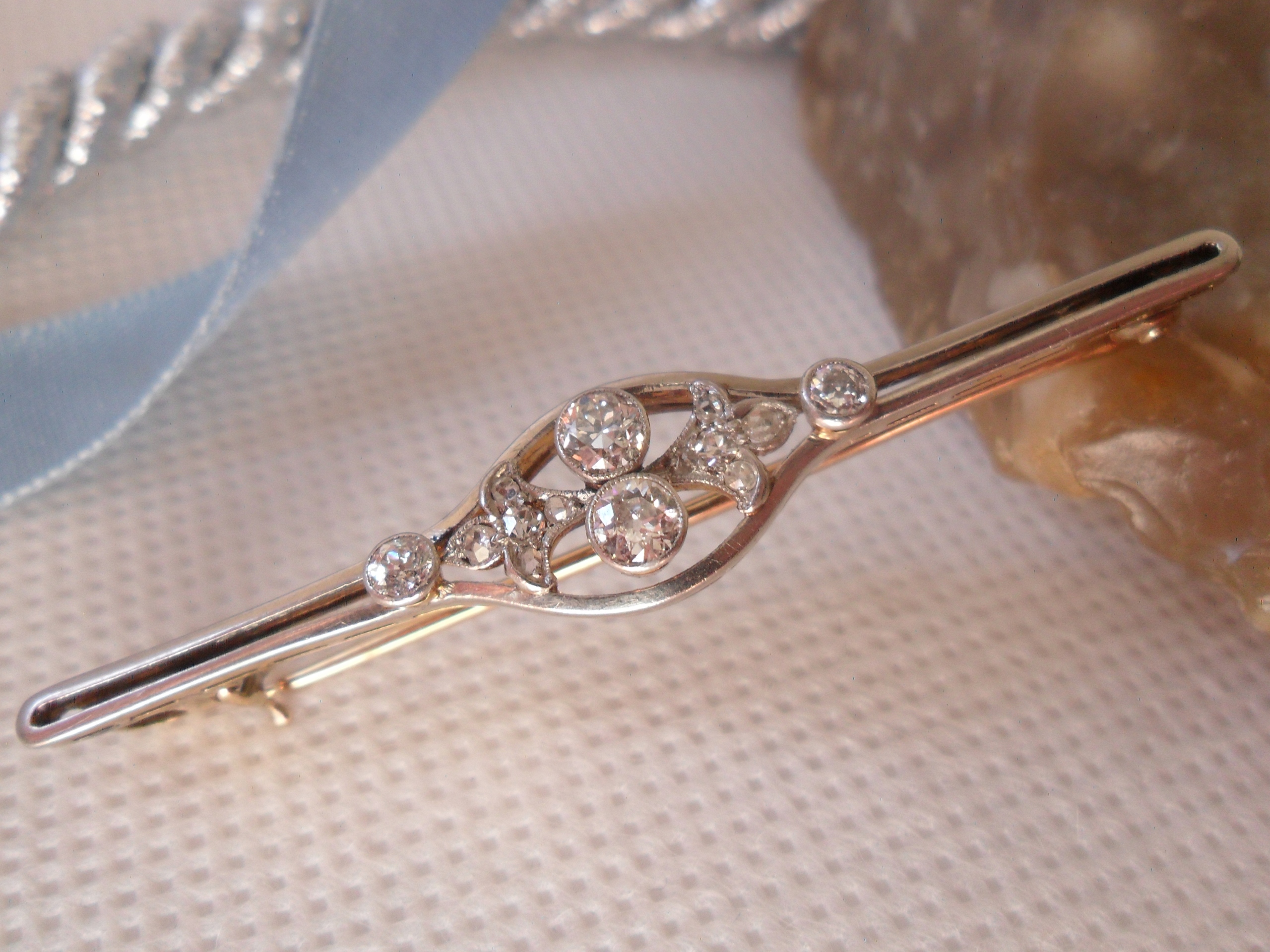 Брошка виготовлена зі срібла та золота, проба 585. Оздоблення; Діаманти в старих діамантах і розетках у сріблі. Розміри ромба; два великих середніх діаметром приблизно 4 мм, висотою приблизно 3,2 мм - загалом приблизно 0,60 карата, два по 2,5 мм кожен - приблизно 0,10 карата, 4 кожен приблизно 1,6 мм - приблизно. 0,10 карата, по 6 штук приблизно 1,2 мм - 0,05 карата. Всього приблизно 0,85 карат. Чистота SI Color of White - W. Розміри брошки; довжина 5,45 см, ширина макс. 1 см. Вага 4700 грам. Стан як на фото. Аукціон не включає упаковку.