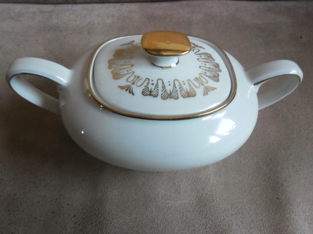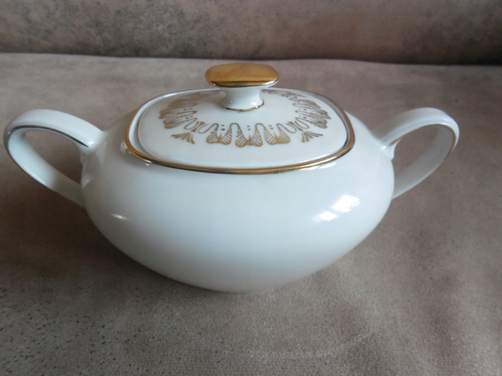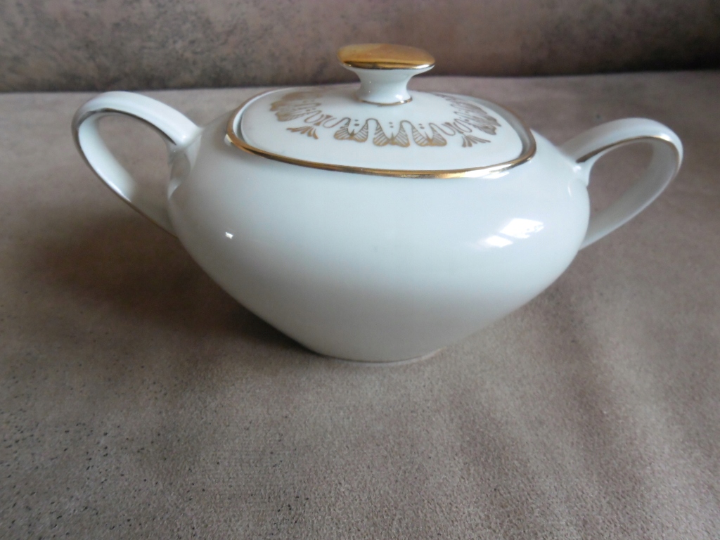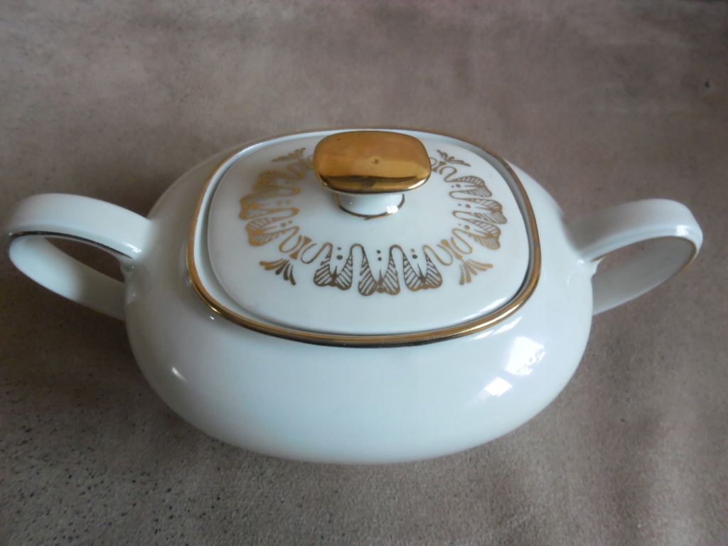 ЧУДА ЦУКЕРНИЦЯ В АР-ДЕКО КОЛЬОРУ ЕКРЮ ЕШЕНБАХ, 1945 Р., ЦІКАВЕ ПОЗОЛОЧЕННЯ, ДУЖЕ ХОРОШИЙ СТАН. ДЕТАЛІ ВИДНІ НА ФОТОГРАФІЯХ.