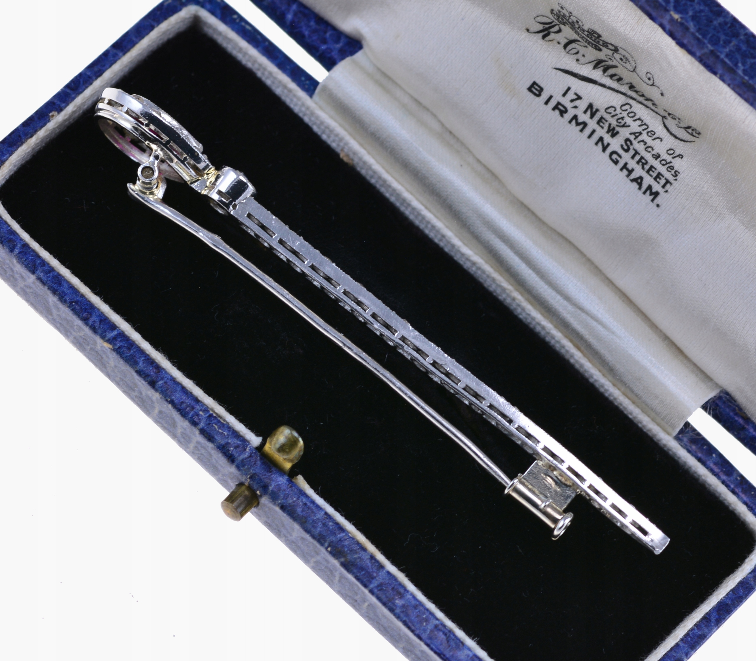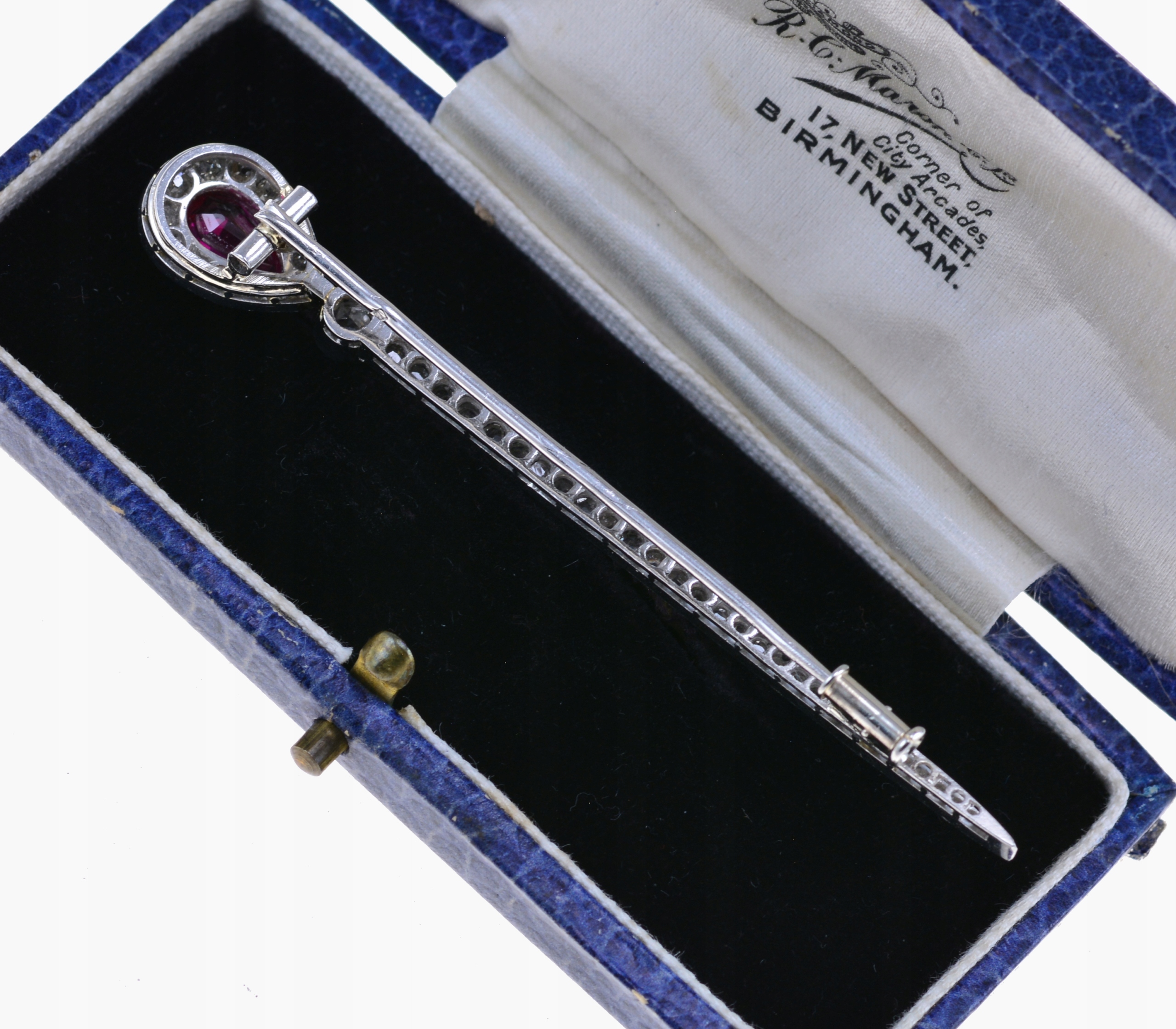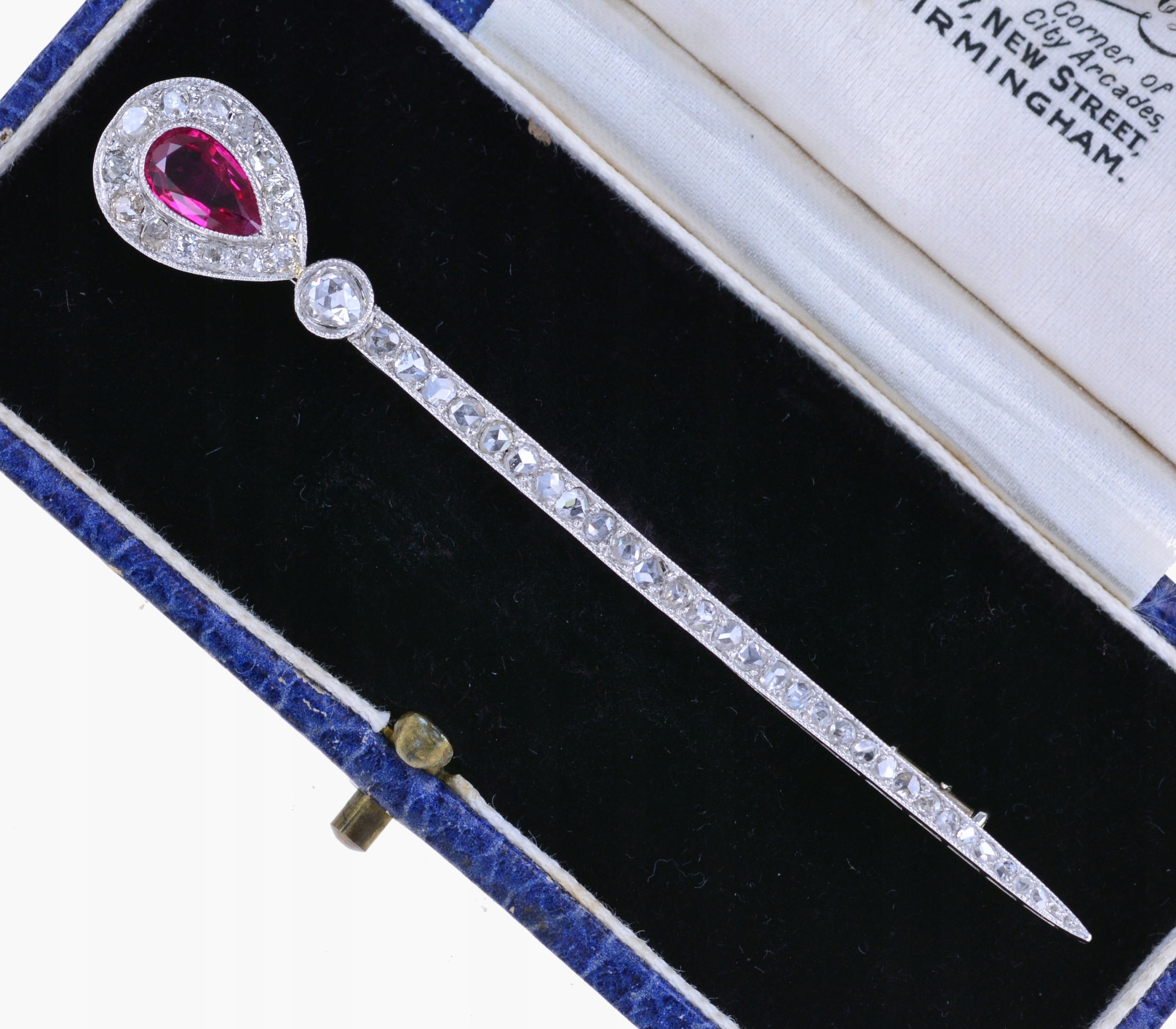 Предметом продажу є елегантна старовинна французька брошка з платини. Його верхня частина прикрашена синтетичним рубіном огранювання, оточеним вінком із дрібних діамантів старої огранки. Довгий, тонкий елемент брошки також прикрашений рядом блискучих діамантів загальною вагою 0,95 карата. Ця легка та витончена брошка є квінтесенцією елегантності того часу.