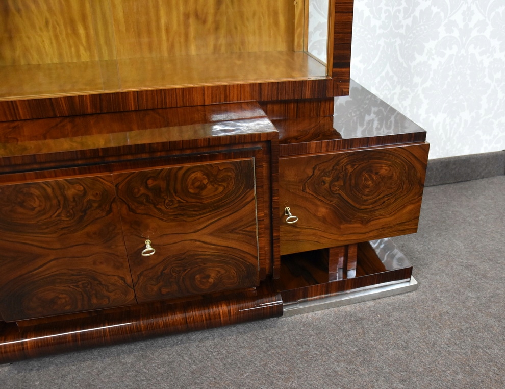 Табель виготовлений шпоном волоського горіха, палісандрового дерева, червоного дерева та берези. на дерев'яну конструкцію хвойних і листяних порід і фанеру. Меблі оброблені шелаковим лаком, нанесеним вручну за допомогою подушечки, до високого блиску із закритими порами. Кольори до ремонту були збережені, отримано природний колір деревини, який гарно підкреслює текстуру окремих порід.