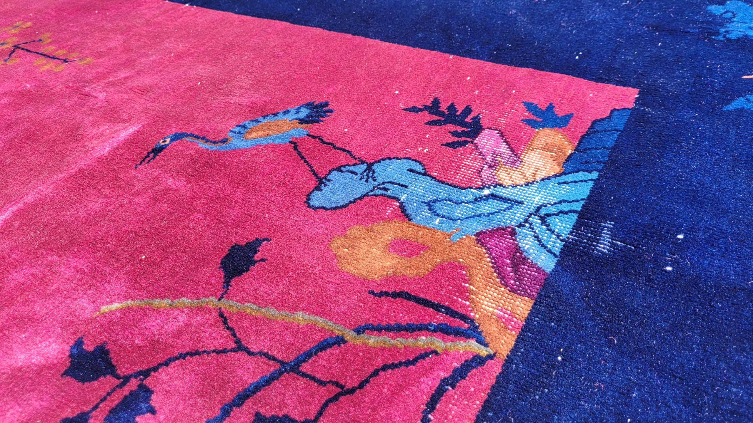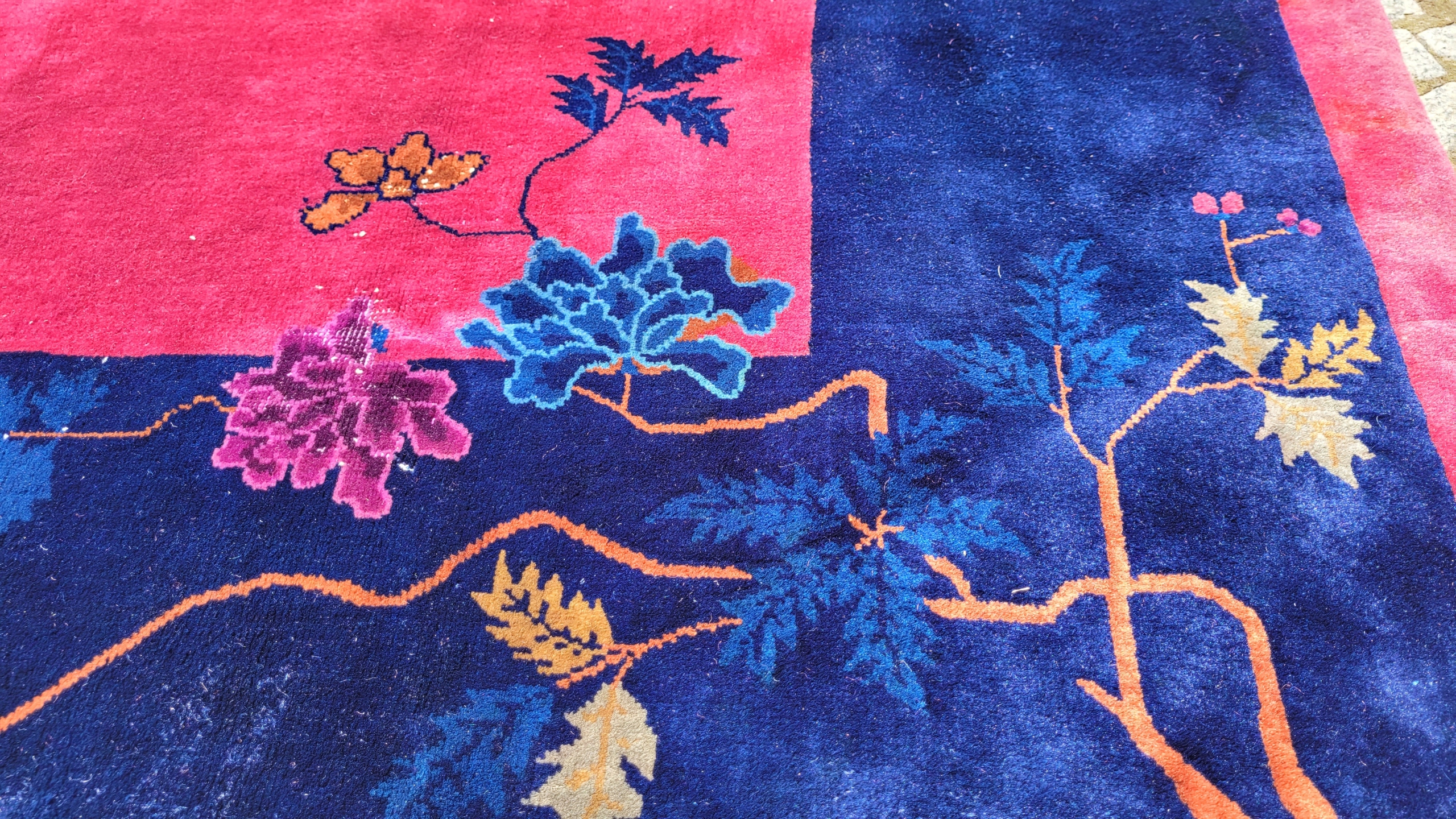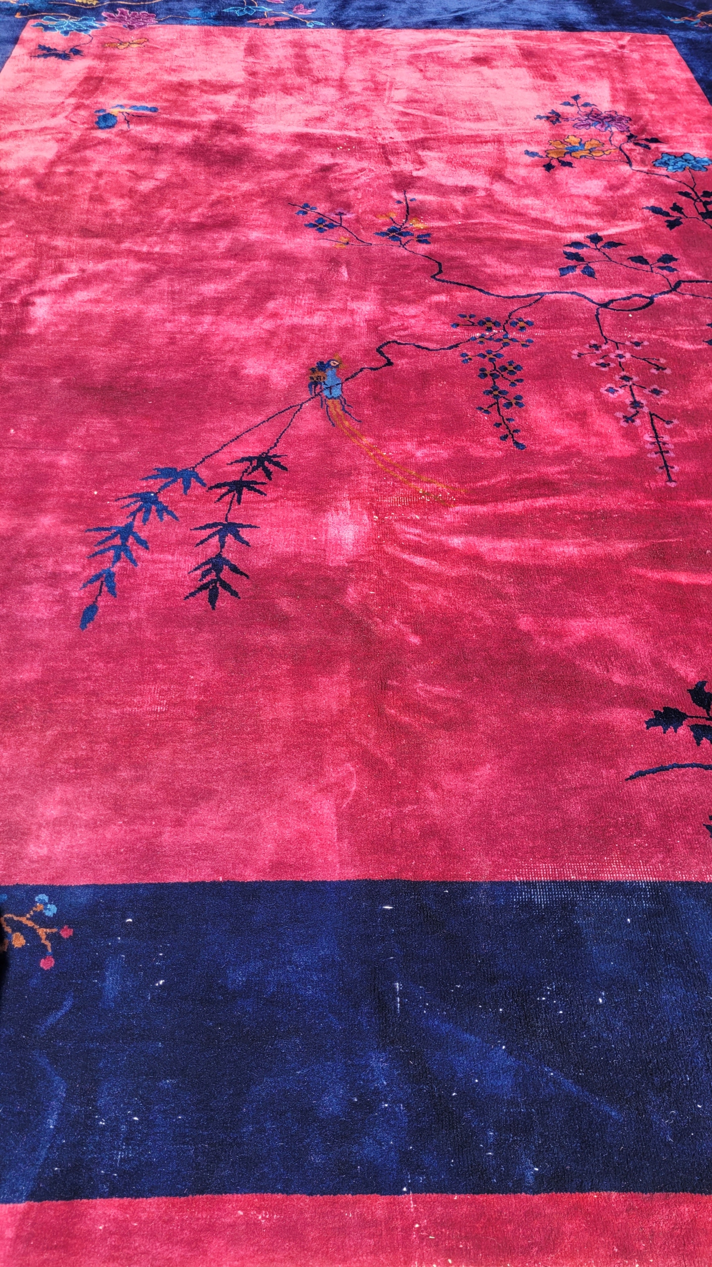 Прекрасний старовинний китайський килим у стилі арт-деко. Виткана вручну з вовни найвищої якості. Він характеризується компактним, блискучим флісом і красивими кольорами. У хорошому стані, видно на фотографіях.