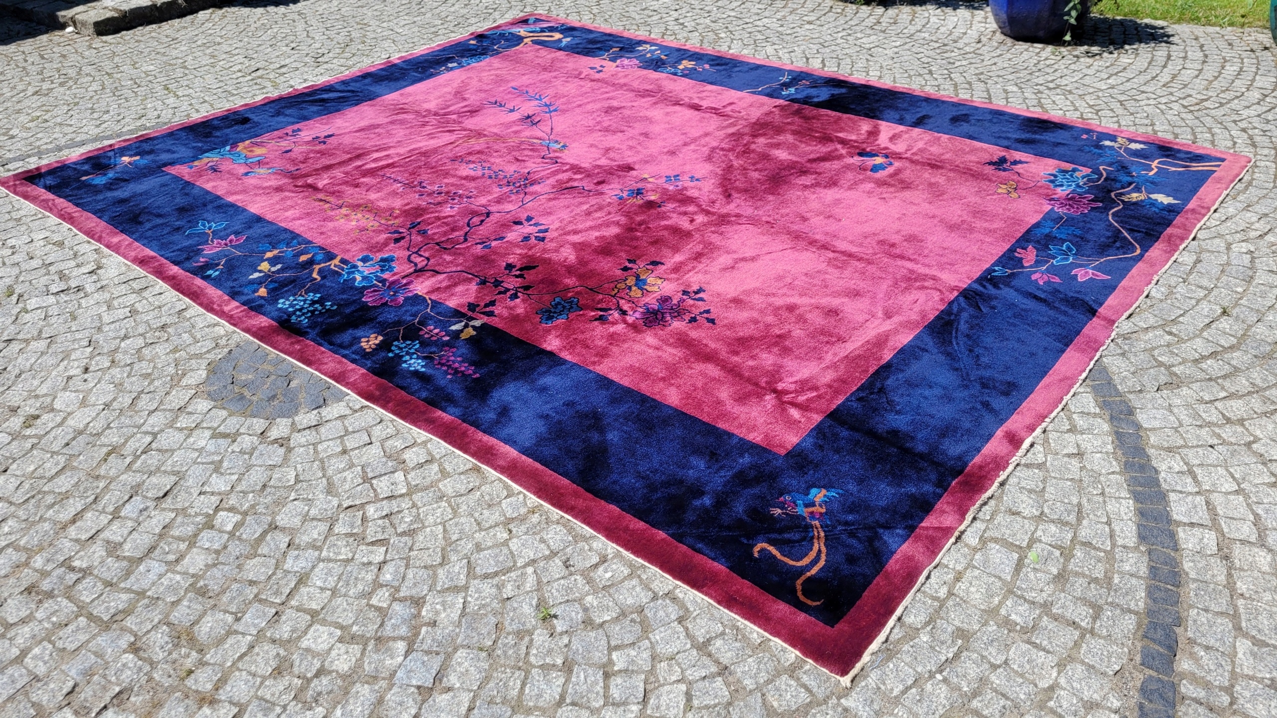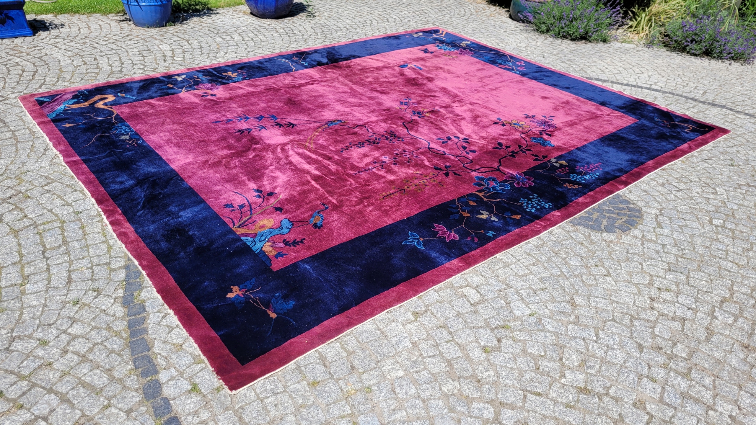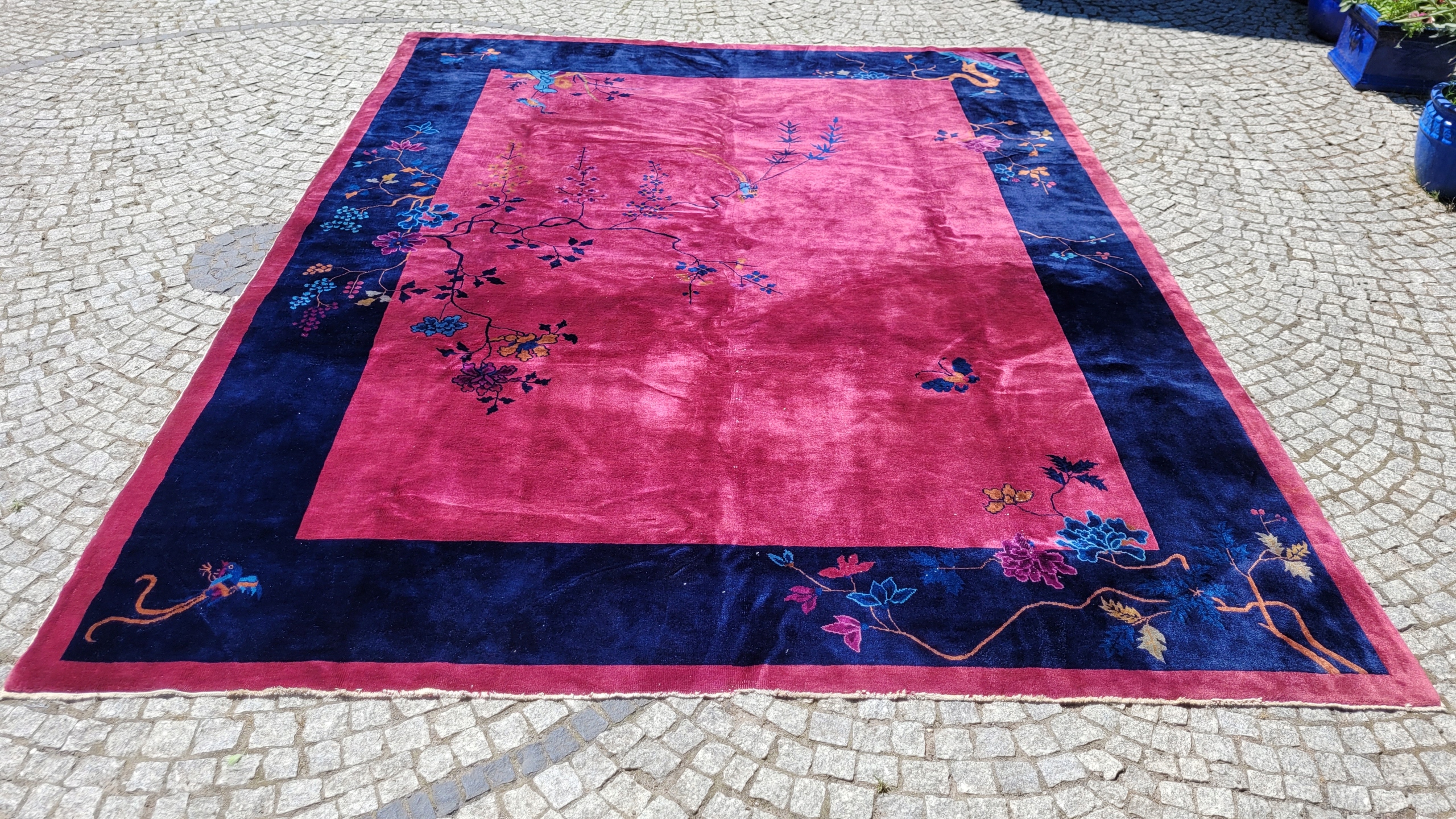 Прекрасний старовинний китайський килим у стилі арт-деко. Виткана вручну з вовни найвищої якості. Він характеризується компактним, блискучим флісом і красивими кольорами. У хорошому стані, видно на фотографіях.